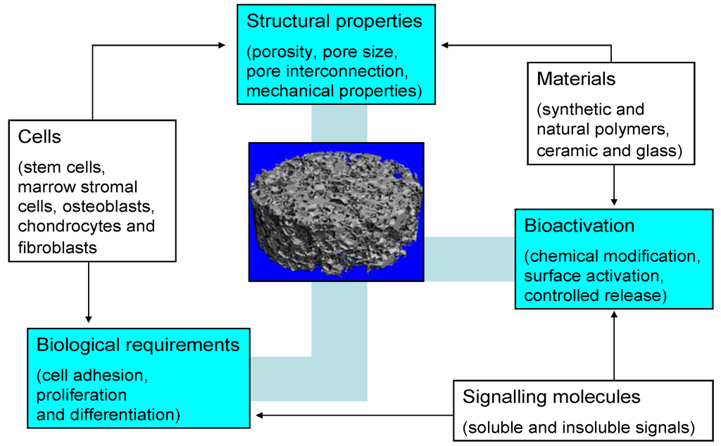 Schematic diagram of key factors involved in the design of optimal scaffolds for bone tissue engineering (modified after reference [3]).