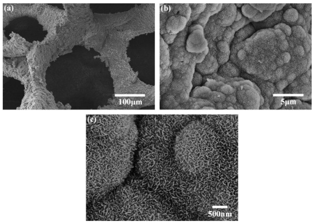 SEM images of the surface of a 13–93 glass scaffold fabricated by a foam replication method, after immersion for 7 days in SBF: (a) lower magnification image; and (b, c) higher magnification image showing fine needle-like hydroxyapatite crystals [105]. Figure reprinted with permission of Elsevier.