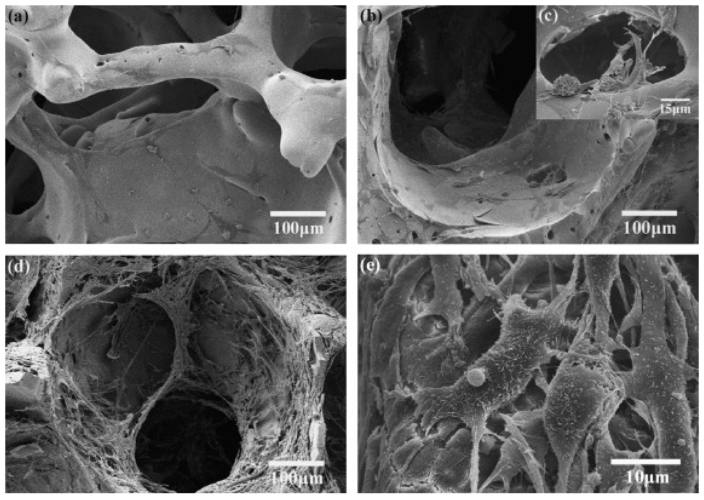 SEM images of 13–93 glass scaffolds seeded with MC3T3-E1 cells and cultured for: (a) 2 days; (b, c) 4 days; and (d, e) 6 days [105]. Reprinted with permission of Elsevier.