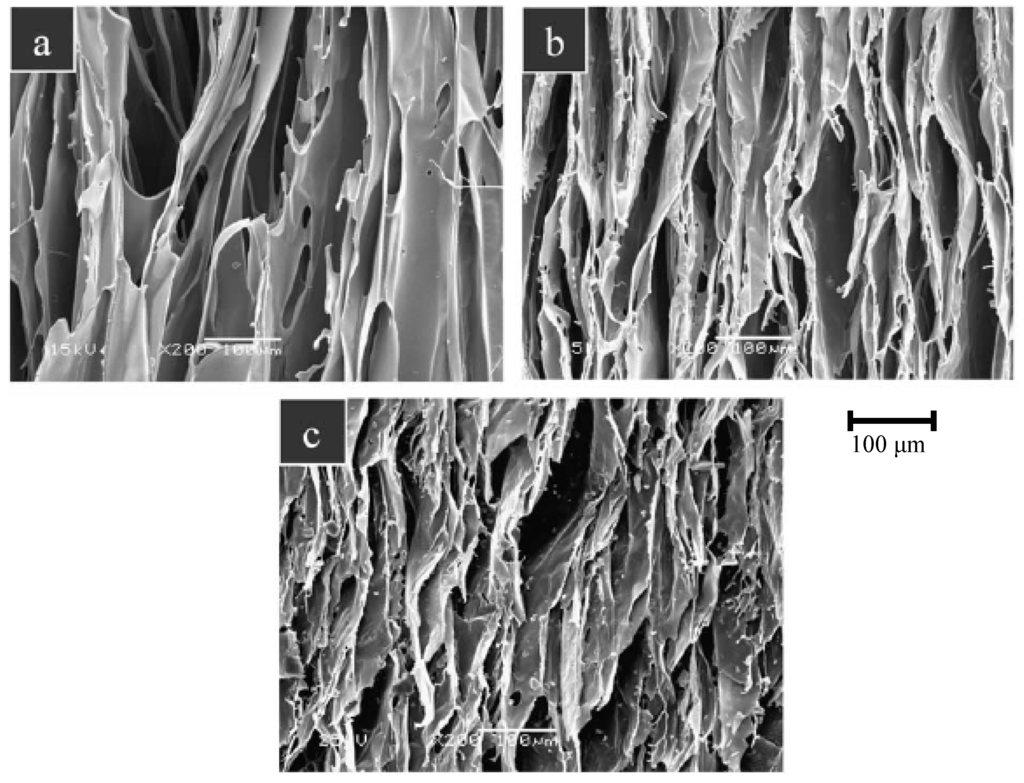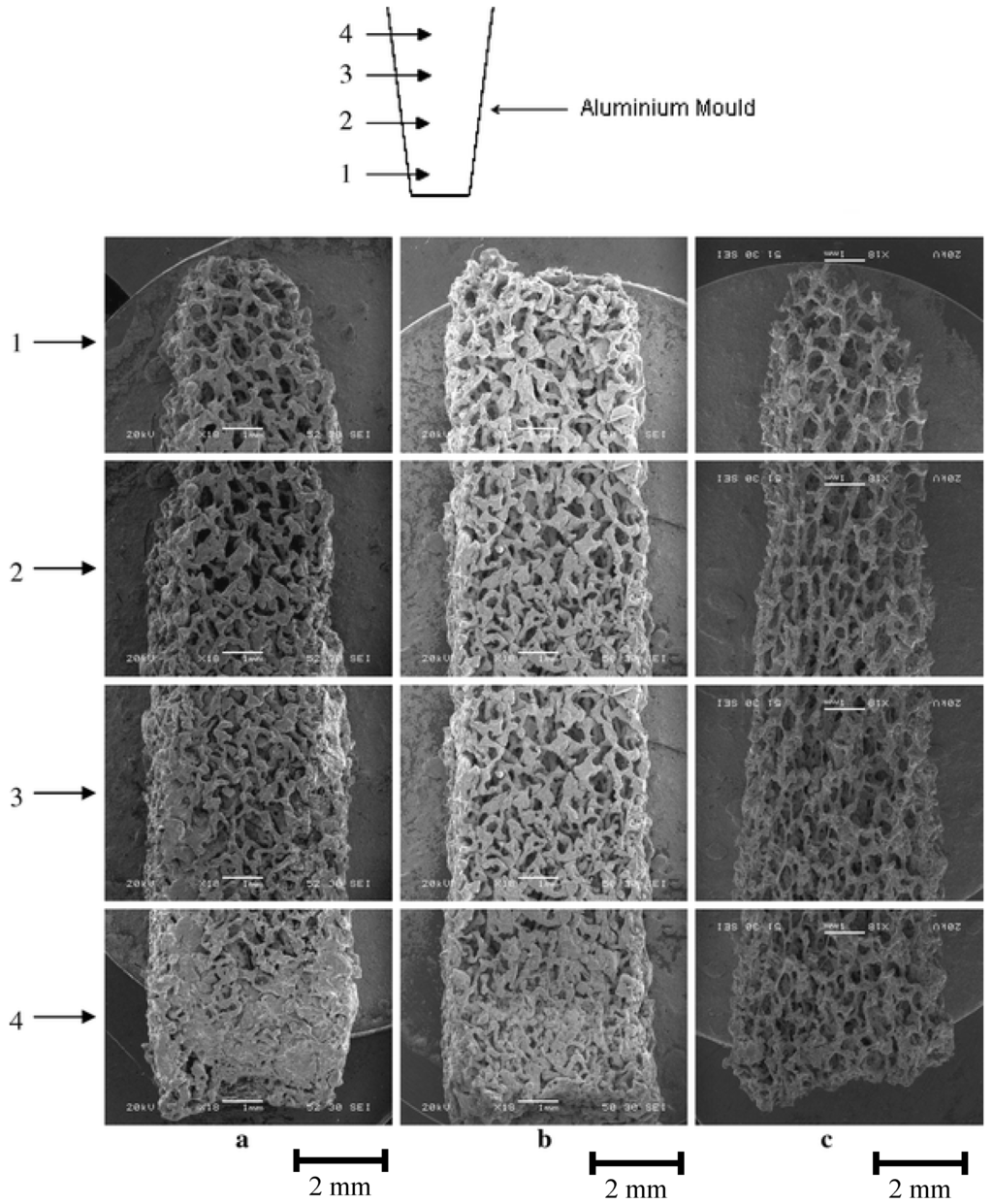 SEM images of scaffolds with 3D continuous porosity gradient after sintering at different degrees of compaction in aluminum mould: (a) 75%, (b) 65%, (c) 50%. Reprinted from ref. [103], with permission from Springer Netherlands.