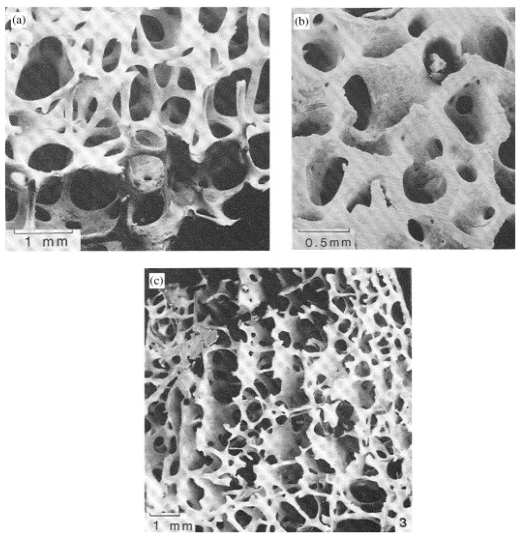Scanning electron micrographs showing the cellular structure of trabecular bone. (a) Specimen taken from the femoral head, showing low-density, open-cell, rod-like structure. (b) Specimen taken from the femoral head, showing a higher density, perforated plate-like structure. (c) Specimen taken from the femoral condyle, of intermediate density, showing an oriented structure, with rods normal to parallel plates. Figure reprinted from reference [138] with permission of Elsevier.