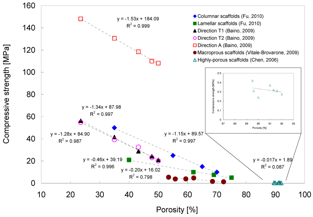 The large variations in compressive strength values of the scaffolds can be interpreted by different fabrication methods, glass compositions, pore morphologies, pore sizes, pore size distributions, shape and thickness of struts (leading to anisotropic mechanical properties), as well as by different compressive strength test parameters employed (sample geometry, size, loading speed). A linear correlation has also been found between porosity and elastic modulus of glass-ceramic scaffolds using ultrasonic wave propagation [112] (Figure 9).