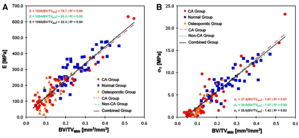 Linear regression models illustrating that (A) compressive modulus of elasticity and (B) compressive yield strength of non-cancer (Non-CA), normal and osteoporotic, and metastatic cancer (CA) cancellous bone specimens are functions of bone volume fraction (BV/TVMIN) regardless of the underlying pathology. Specimen groups: cancer (CA, red), non-cancer (green), cancer and non-cancer combined (black). Reprinted from reference [128], with permission of Springer-Verlag, New York.