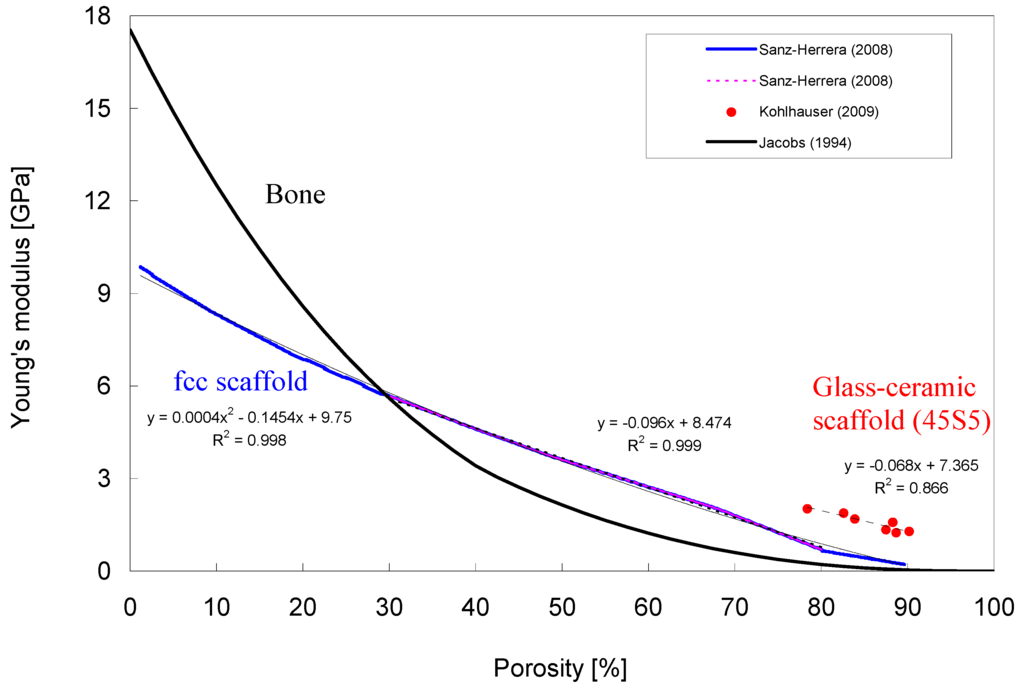 Young’s modulus of an fcc scaffold microstructure [141] and of bone [139] as a function of porosity (Data kindly provided by Prof. J. A. Sanz-Herrera, University of Seville, Spain). The pink, dashed line, overlapping the blue line, represents the data range (porosity of fcc structure = 30–80%), in which a highly linear relationship between porosity and Young’s modulus exists. A second order polynomial function describes the Young’s modulus of the fcc structure over the entire range of investigated porosities (1.2–89.6%). For Bioglass®-based glass-ceramic scaffolds (data adapted from ref. [112]), a highly linear negative correlation (coefficient of determination R2 = 0.866) between porosity and elastic modulus was found on the basis of ultrasonic wave propagation measurements.