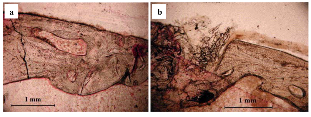 In a pilot study, Moimas et al. [113] created cortical holes in the tibia of rabbits and filled the cavities with bioactive glass fibrous scaffolds as well as with 45S5 Bioglass® particles (PerioGlas®). After 6 months of implantation, the histology showed that three-dimensional implants were more effective than PerioGlas® particles in helping new bone formation and remodeling (Figure 11). Tomographic analysis of the negative control (empty defects) and of the filled defects provided evidence of the superiority of the empty defect as regards cortical bone formation. However, filling using the three-dimensional constructs aided trabecular bone formation also in areas in which bone was not naturally present. In a similar in vivo study using a rabbit calvarial bone model, San Miguel et al. [124] reported superior osteoconductive behavior (i.e., significantly higher bone formation, bone deposition) of SBF-pretreated scaffolds (BG fiber constructs) compared with non-treated porous BG scaffolds, bioactive glass granules (PerioGlas®) and empty bone defects.