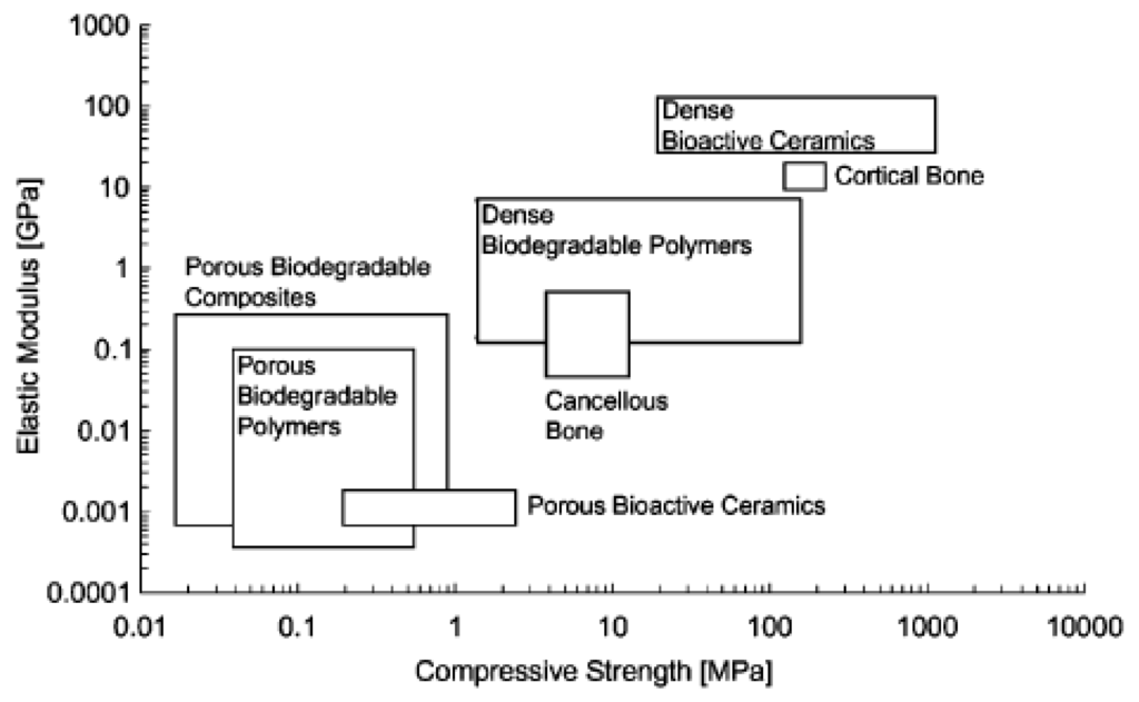 Ideally, the elastic modulus of the scaffold should be comparable to that of the tissue to be replaced in order to promote load transfer and minimize stress shielding, reducing the problems of bone resorption [132]. Stress shielding describes the mismatch in elastic moduli between biomaterial and the adjacent/surrounding bone. In case of large elastic mismatch, bone becomes “stress shielded”, which is undesirable since living bone must be under some tensile load stimuli to remain healthy. In the literature, depending on the measurement technique and parameters used, the source of bone and the structural variation in bone from the same source, a wide range of values has been reported for the compressive modulus of trabecular (0.12–1.1 GPa) and cortical bone (11.5–17 GPa) (Table 2 ).
