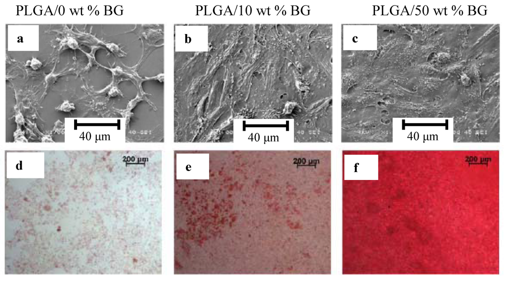 - Yao, J.; Radin, S.; Leboy, P.S.; Ducheyne, P. The effect of bioactive glass content on synthesis and bioactivity of composite poly (lactic-co-glycolic acid)/bioactive glass substrate for tissue engineering. Biomaterials 2005, 26, 1935–1943. [Google Scholar] [CrossRef] [PubMed]