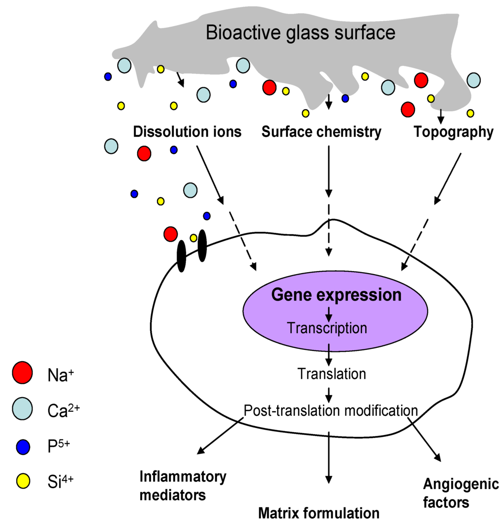 Fabrication techniques for bioactive glasses include both traditional melting methods and sol-gel techniques [1,3,4,10,31,32,33], the latter are being highlighted elsewhere [34] and are not covered in this review. The typical feature common to all bioactive glasses, being melt or sol-gel derived, is the ability to interact with living tissue, in particular forming strong bonds to bone (and in some cases soft tissue [35,36], a property commonly termed bioreactivity or bioactivity [1], as mentioned above. It is now widely accepted that for establishing bond with bone, such a biologically active apatite surface layer must form at the material/bone interface [1,8,11,12,37] (see also discussion in §4). Thus, the basis of the bone bonding property of bioactive glasses is the chemical reactivity in physiological body fluids (in vitro and in vivo) resulting in the formation of a hydroxycarbonate apatite (HCA) layer to which bone can bond. This bonding to living bone tissue occurs upon a sequence of reactions on the material surface [9] followed by cellular reactions [5], both of which are explained in detail elsewhere [1,5,9,11,12]. Briefly, the processes on the glass surface are characterized by ion leaching/exchange, dissolution of the glass network and precipitation and growth of a calcium-deficient carbonated apatite (HCA) surface layer, whereas cellular reactions include colonization, proliferation and differentiation of relevant (bone) cells [11,12] (Figure 1). In parallel to the chemical reactions on the material surface leading to bone bonding, recent studies have proven that ion dissolution and release from BG activate gene expression in osteo-genitor cells that give rise to enhanced bone regeneration (see §4.1).