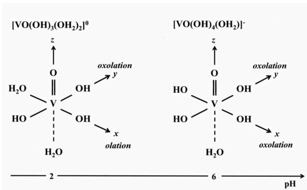 In dilute solutions, where only monomolecular species are formed, we may then assume that the deprotonation of the neutral precursor [VO(OH)3(OH2)5]0 leads to anionic species such as [VO(OH)4(H2O)]- that upon dehydration would give more or less protonated tetrahedral vanadate anions [HnVO4](3-n)-.