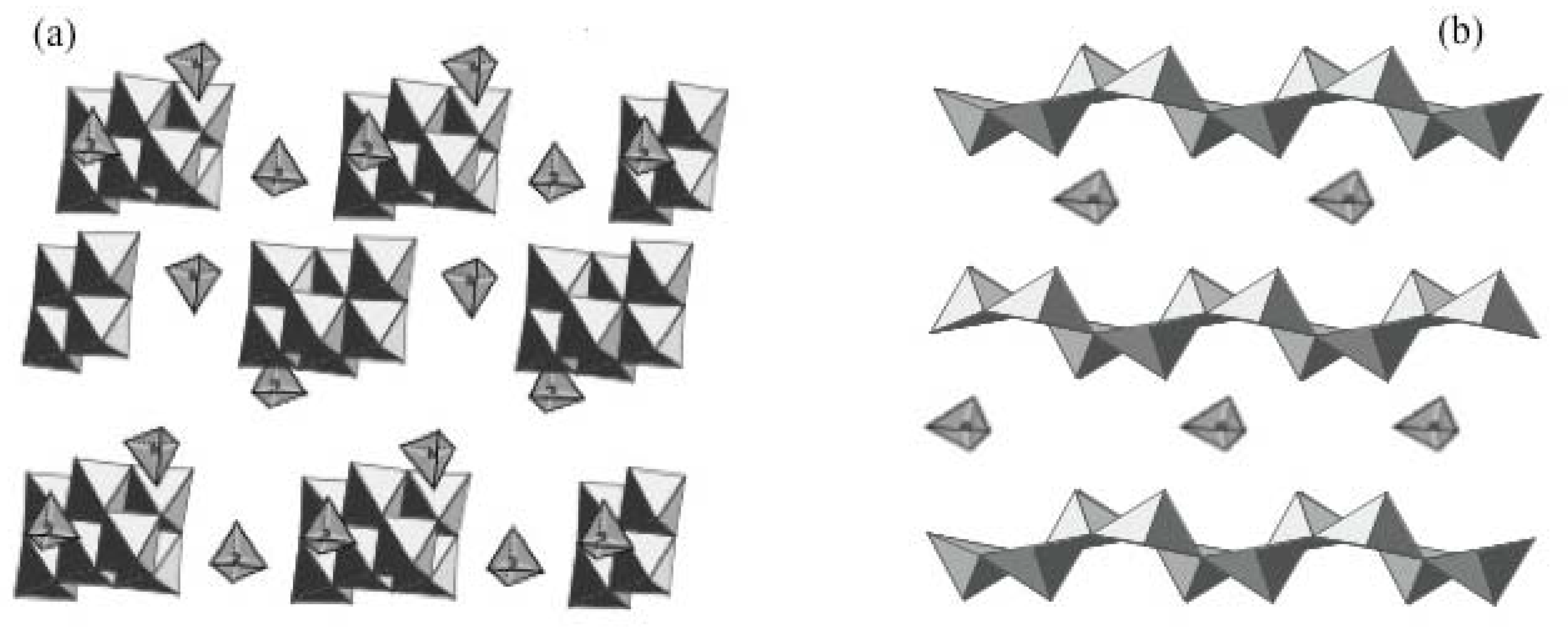 - Riou, D.; Roubeau, O.; Ferey, G. Evidence for the solid state structural transformation of the network type decavanadate into a lamellar topology. Z. Anorg. Allg. Chem. 1998, 624, 1021–1025. [Google Scholar] [CrossRef]