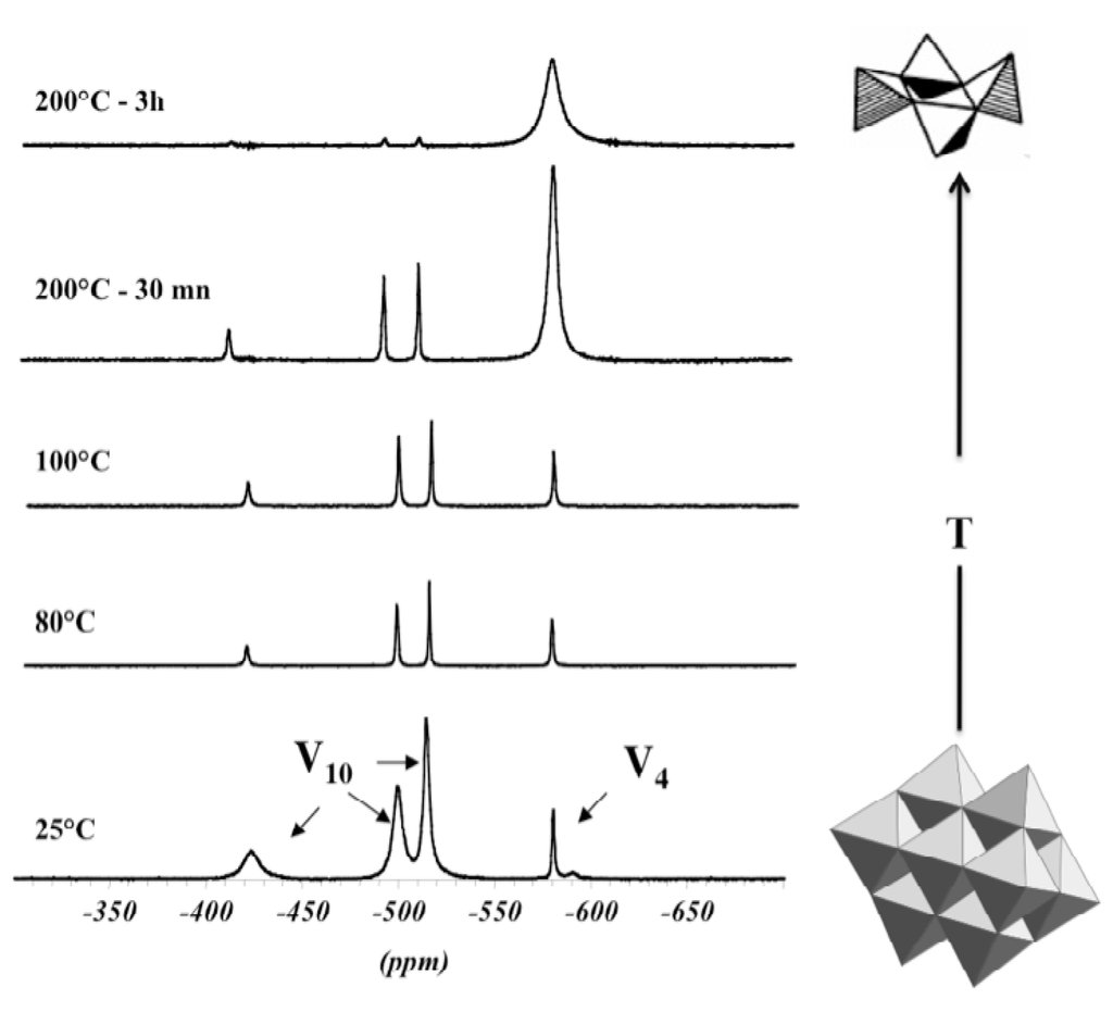 These experiments suggest that the molecular structure of V(V) precursors in aqueous solutions does not depend only on pH, but also on temperature. 51V NMR experiments, performed at different temperatures, show that decavanadate solutions progressively transform into cyclic metavanadates [V4O12]4- upon heating []. Only metavanadates are observed around 200 °C (Figure 5). Deprotonation occurs upon heating, leading to the dissociation of decavanadates into metavanadates as follows: