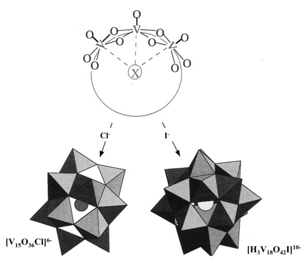 Polyoxovanadate clusters formed in the presence of X- anions [V15O36Cl]6- and [H3V18O42I]10-.