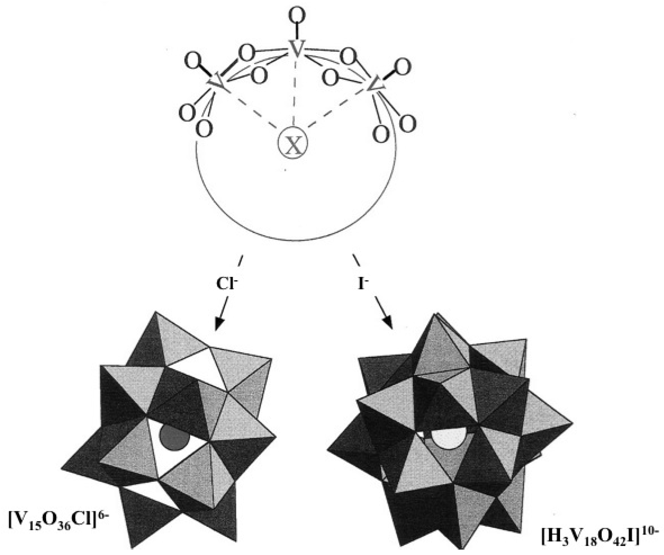 - Müller, A.; Krickemeyer, E.; Penk, M.; Rohlfing, R.; Armatage, A.; Bögge, H. Template-controlled formation of cluster shells or a type of molecular recognition: synthesis of [HV22O54(ClO4)]6- and [H2V18O44(N3)]5. Angew. Chem. Int. Ed. 1991, 30, 1674–1677. [Google Scholar] [CrossRef]