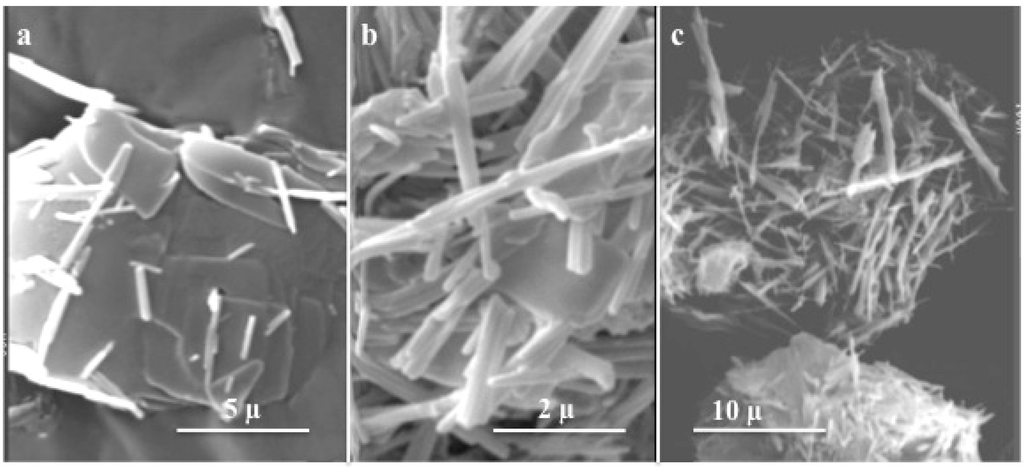 VOx nanotubes are currently formed via hydrothermal syntheses (≈180 °C, few days) in the presence of long chain alkyl amines such as HDA (HexaDecyl Amine). Different precursors have been used such as vanadium pentoxide V2O5 [,], vanadium alkoxides VO(OR)3 [,], vanadium oxychloride VOCl3 [], ammonium metavanadate NH4VO3 [] or vanadium oxide gels V2O5,nH2O [,]. In all cases, layered vanadium oxides are formed in the aqueous solution that then roll up into nanotubes [,]. A mixture of vanadium oxide nanotubes and unrolled vanadium oxide sheets can be observed during the hydothermal treatment, confirming the link between nanotubes and exfoliated lamellar intermediates []. The number of plate-like particles progressively decreases with time while more nanotubes are formed and only nanotubes are observed after few days (Figure 7).