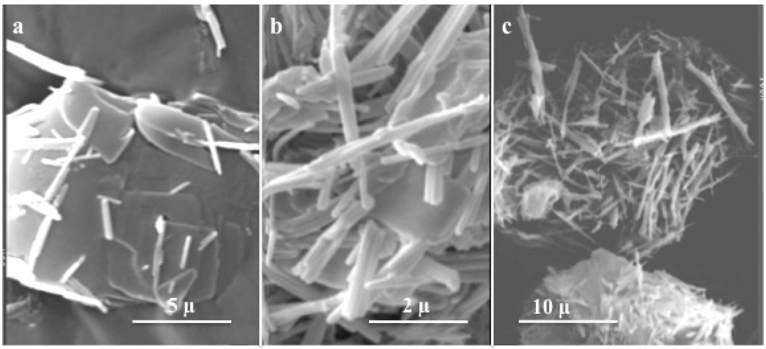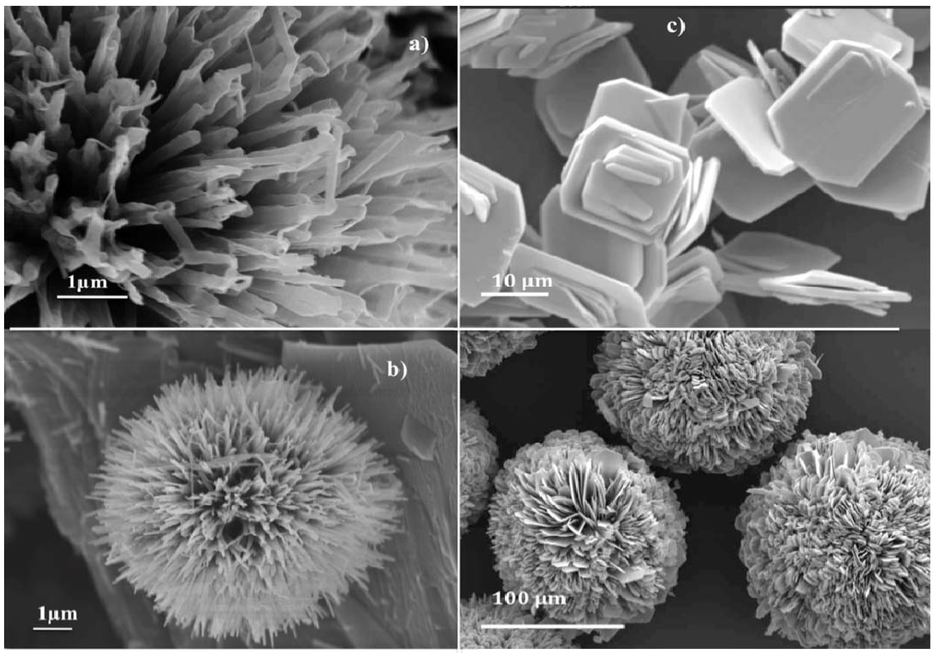 - O’Dwyer, C.; Navas, D.; Lavayen, V.; Benavente, E.; Santa Ana, M.A.; G. Gonzalez, G.; Newcomb, S.B.; Sotomayor Torres, C.M. Nano-urchin: the formation and structure of high-density spherical clusters of vanadium oxide nanotubes. Chem. Mater. 2006, 18, 3016–3022. [Google Scholar] [CrossRef]