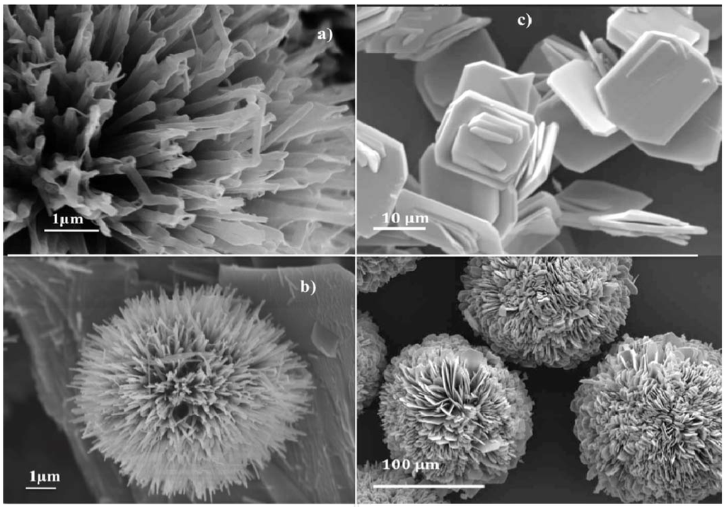 Roselike nanostructured vanadium oxide films have been synthesized from water-ethanol solutions of vanadium tri-isopropoxide VO(OPri)3, using hexadecylamine as a template. These films are obtained by drop-casting of the solution onto Si wafers. They are made of radially packed petal-like flat structures giving rise to spherical aggregates about 40 nm in diameter. These films exhibit photo‑induced hydrophilic properties. They can switch reversibly between superhydrophobic and superhydrophilic under UV irradiation and dark storage respectively []. Similar roselike nanostructures have also been obtained via the thermal decomposition of ammonium vanadium sulfate hydroxide [NH4V3(OH)6(SO4)2]. This compound synthesized via the hydrothermal treatment of NH4VO3 with oxalic acid in a DMSO-H2O solvent is made of flat particles that self-assemble into a rose-like structure. A pure V2O5 phase is obtained upon calcination at 500 °C without destroying the flower morphology []. Such flower-like nanostructures are not limited to V(V) oxides, nanostructured reduced vanadium oxides such as VO2 petaloid clusters or VOOH hollow dandelions have also been described recently [,].