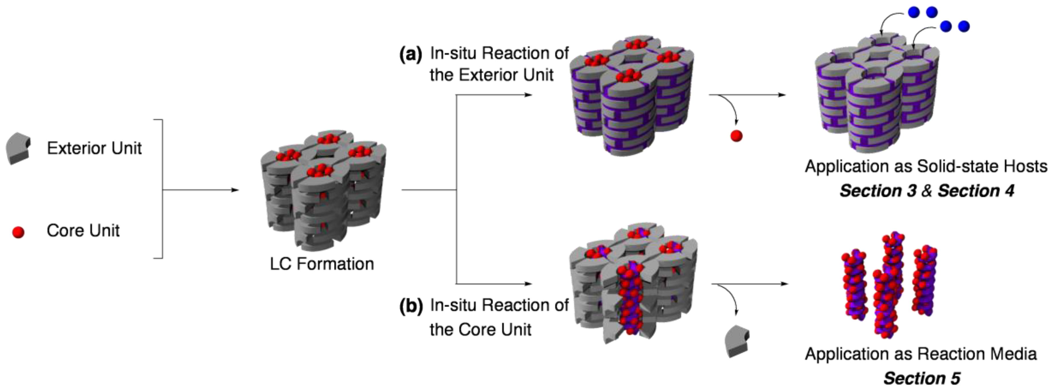 Traditional thermotropic LCs are composed of a single mesogen, or a mixture of a few mesogens with a similar structure. When a reactive functionality is introduced to the mesogen unit, the in situ reactions, both of the intra- and intermolecular reactions, would become possible. These reactions have proven to be powerful tools for scientific studies and practical applications of LCs. For example, the dimerization/polymerization of mesogen units enhance mechanical strength, stabilize LC phases, and memorize structural information [21,22]. On the other hand, intramolecular reactions, such as isomerizations, cyclizations, and rearrangements, would lead to stimuli-responsive systems [23], or serve as probes to investigate the structure/properties of LCs [24]. Although the resultant materials would find various applications, such as photo-optical/electronic devices, their self-completed structures are not suitable to accommodate exterior guest molecules.