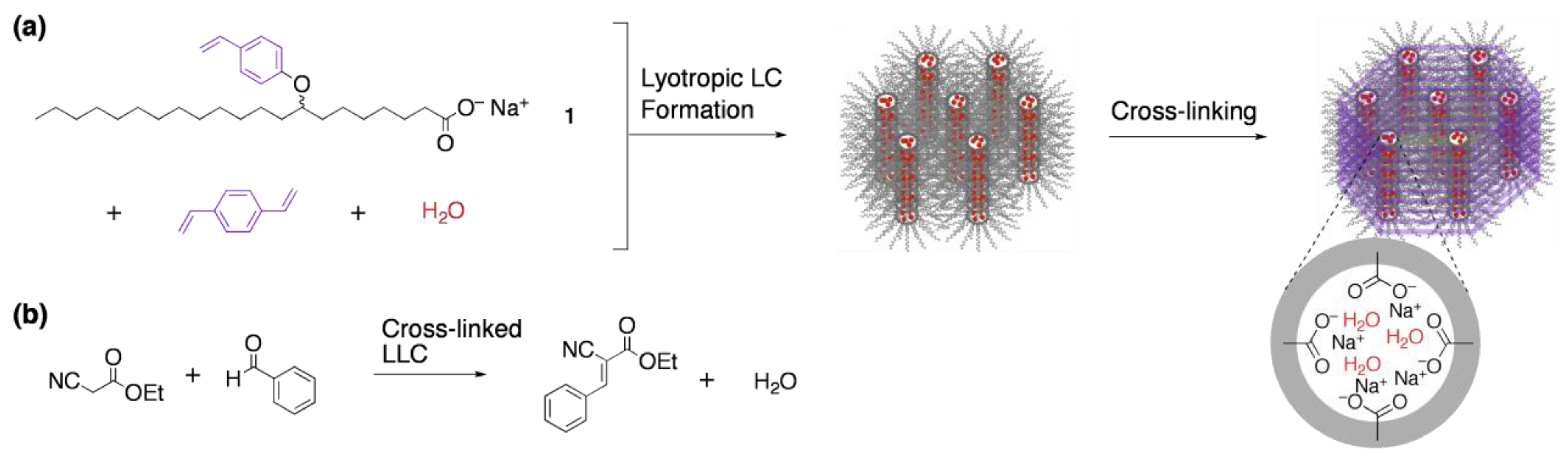 As a pioneering work in this field, Gin and co-workers have extensively studied the development of functional materials based on the cross-linking of lyotropic LCs with inverted hexagonal and bicontinuous cubic structures [33]. They developed a polymerizable amphiphile, a styryl derivative of sodium 9-octadecanoate (1). By mixing 1, water, and divinylbenzene in an appropriate ratio, an inverted hexagonal lyotropic LC phase was formed, which can be cross-linked by the photopolymerization (Figure 2a). Through the cross-linking process, the original hexagonal structure was retained. The cross-linked polymer acted as an effective heterogeneous catalyst for the Knoevenagel condensation of ethyl cyanoacetate with benzaldehyde (Figure 2b). Catalytic efficiency of the cross-linked polymer was superior to that of the sodium- exchanged versions of zeolite-Y and MCM-41, which might be attributable to the enhanced basicity of the sodium carboxylate groups (pKa = ca. 9) due to the confinement within the narrow aqueous channels. Although the size-selective catalysis was not explored in this report, preliminary experiments proved that the cross-linked polymer showed size exclusion ability; upon soaking the cross-linked polymer in a solution of a cationic dye, efficient incorporation took place only when the dye was smaller than the diameter of the channel (15–20 Å).