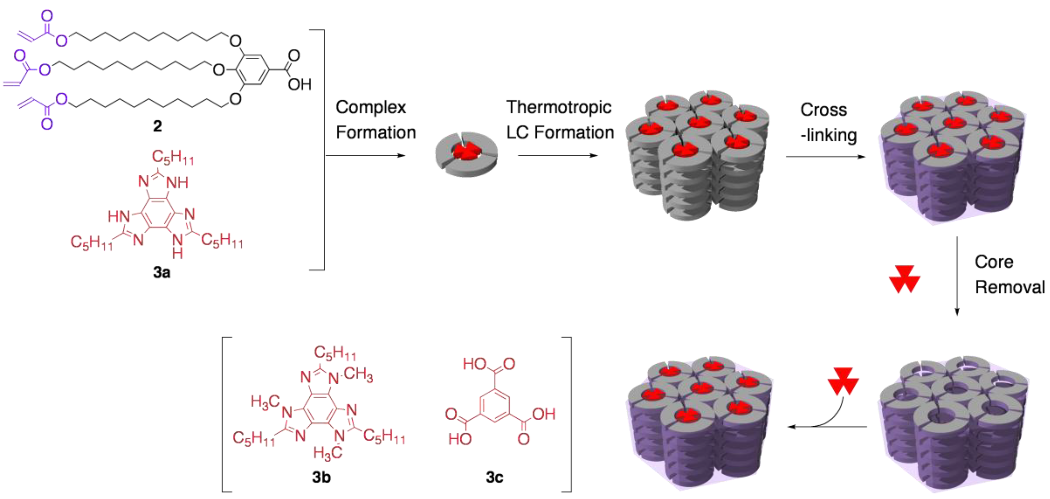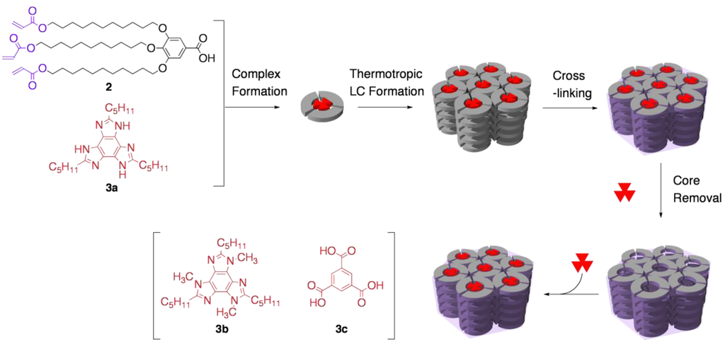 As a representative example, Kim and co-workers have reported a nanoporous cross-linked polymer with hexagonal columnar channel, based on a 3:1 supramolecular complex of a polymerizable amphiphilic carboxylic acid 2 with a benzotris(imidazole) core 3a (Figure 3a) [37]. The complex spontaneously formed a hexagonal columnar LC phase. Upon irradiation of the LC with UV light, the polymerization of the acryloyl moieties readily proceeded to give the cross-linked polymer. By the treatment of the resultant polymer with acidified methanol, ca. 90% of the template was extracted. Through the cross-linking and template-removal processes, the polymer maintained the same hexagonal columnar structure. Worth noting is that nitrogen gas permeability constant of the de-cored cross-linked polymer was four orders of magnitude higher than that of low-density polyethylene, which confirms the porous nature of the cross-linked polymer.