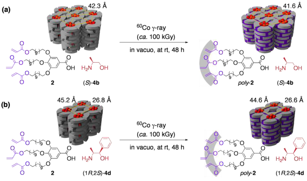 Among these LC salts, 2·(S)-4a (hexagonal) and 2·(1R,2S)-4d (rectangular) were applied to the in situ polymerization. Regardless of the packing mode of the LC structure, the LC-based template polymerization proceeded successfully; upon irradiating 60Co γ-ray to the LC salts, the polymerization of the acryloyl groups quantitatively took place to afford cross-linked polymers, which were insoluble to most of solvents and did not melt at high temperatures. Through the cross-linking process, the original ordered structures in LCs were essentially retained (Figure 4).