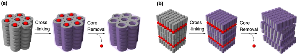 Schematic representation of the fabrication of organic zeolite analogues by the cross-linking of multi-component LCs and the following core removal: (a) hexagonal columnar phase and (b) lamellar phase.