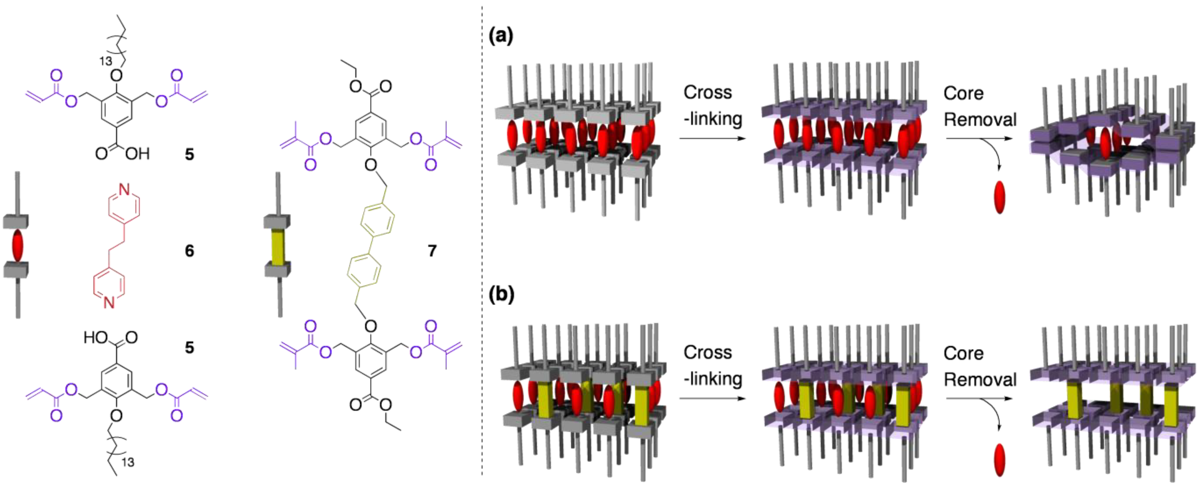As a fundamental skeleton, they newly developed a two-component thermotropic LC with a lamellar structure (smectic A), based on the 2:1 supramolecular complex of a carboxylic acid bearing two acryloyl groups (5) with a dipyridyl core (6). A pillar molecule was also designed as a rodlike molecule possessing polymerizable units (7). When 5 and 10 mol% of the pillar unit 7 was doped in the two-component LC composed of 5 and 6, the resultant mixtures again showed the same lamellar phases. The three LC systems, containing the pillar unit 7 at the molar ratio of 0, 5, and 10%, respectively, were successfully cross-linked by the photopolymerization, where the original lamellar structures were maintained.