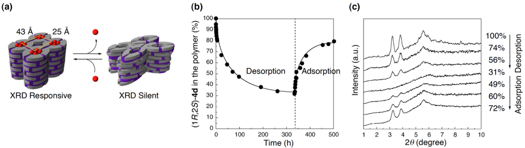 As described in Section 3.3, we developed a cross-linked polymer with rectangular columnar structure (space group; P2m), which was prepared from the LC salt of an polymerizable amphiphilic carboxylic acid 2 with an enantiopure 2-amino alcohol (1R,2S)-4d [16,18]. Through the studies on host–guest chemistry of the cross-linked polymer, we unexpectedly found that our cross-linked polymer expressed a dynamic behavior in response to the desorption and adsorption of guest molecules (Figure 7a) [17].