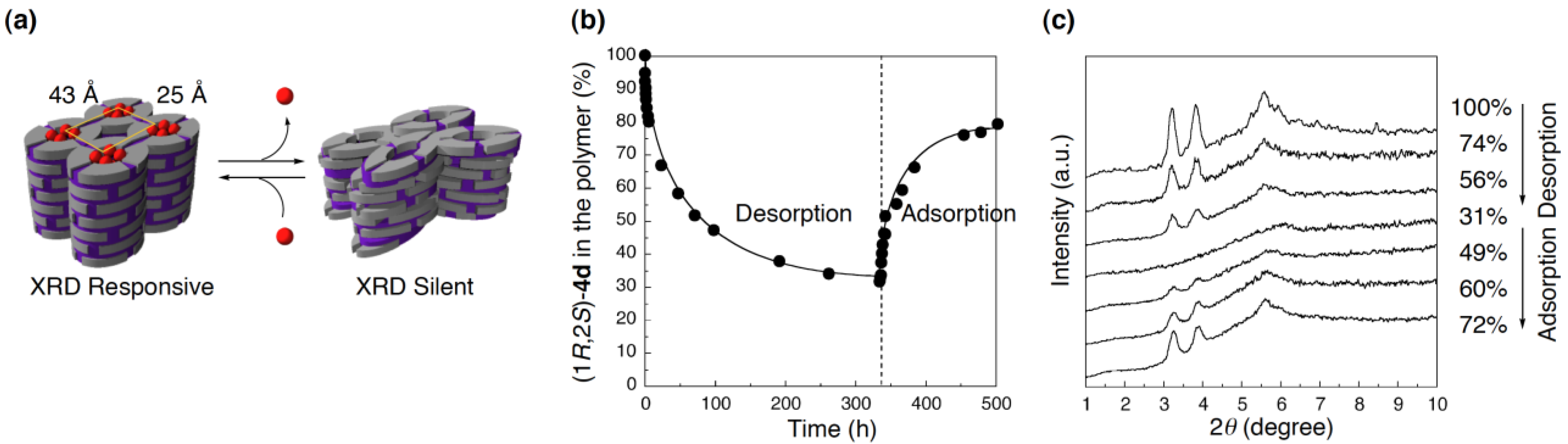 Desorption/adsorption of the template (1R,2S)-4d from/to the cross-linked polymer: (a) Schematic representation of the structural switching; (b) Time course of the desorption/adsorption monitored by HPLC; and (c) XRD profiles of the cross-linked polymer.