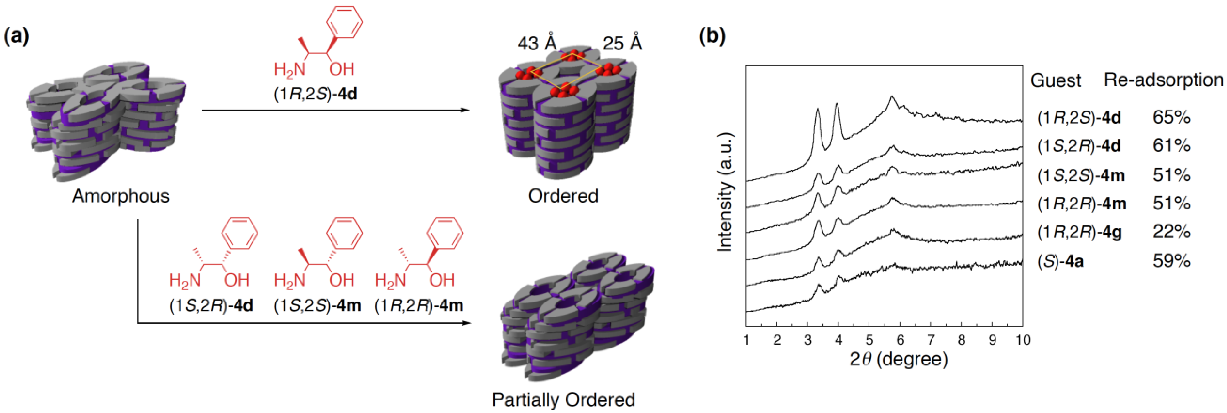 To prove this concept, several 2-amino alcohols with similar structures to that of the original template, (S)-4b, (1S,2R)-4d), (1S,2S)-4m, and (1R,2R)-4m, were employed as triggers to induce the structural change of the de-cored polymer. In every case of these 2-amino alcohols, the polymer exhibited XRD profiles characteristic of the original rectangular columnar structure (Figure 8b). Worth noting is that there was significant difference in reconstitution ability between the original core (1R,2S)-4d and its enantio/diastereo isomers (1S,2R)-4d, (1S,2S)-4m, and (1R,2R)-4m; although the amounts of the re-adsorbed guests at an equilibrium state were almost identical in all of the four cases (51–65%), the intensities of the diffractions of the polymers, reconstituted with these three new guests, were about half that of the corresponding diffractions observed in the reconstitution with (1R,2S)-4d (Figure 8b).