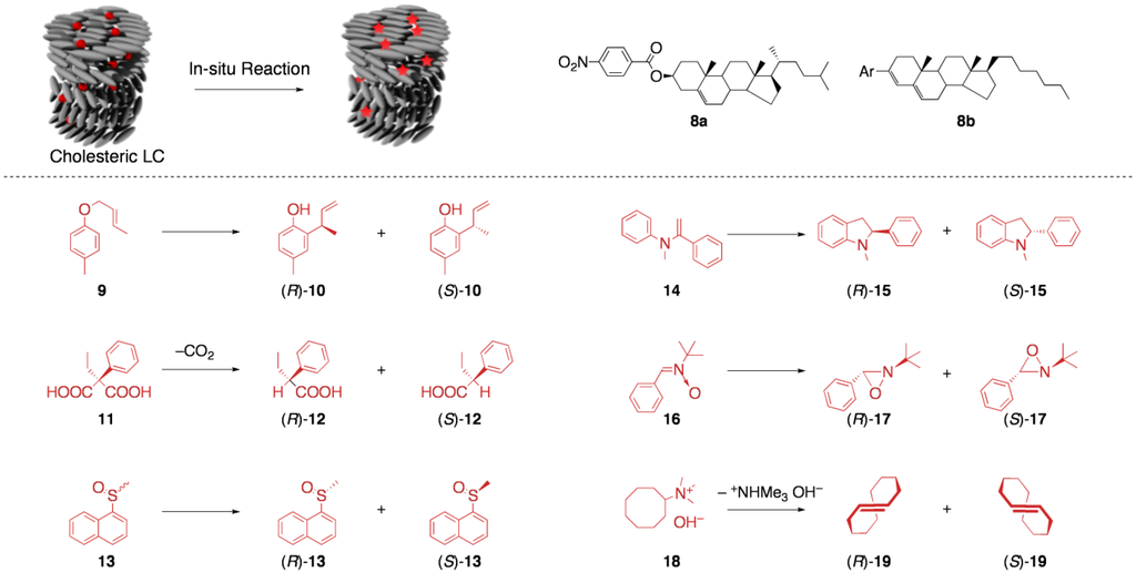 Cholesteric LCs have been extensively studied in the 1970s as media for asymmetric reactions. Apparently, their helical structure seems to be quite promising for the chirality induction in organic transformations. Saeva et al. reported that the Claisen rearrangement of methylallyl p-tolyl ether (9) proceeded in an enantiocontrolled manner in a cholesteric LC mesophase formed by cholesteryl p-nitrobenzoate (8a) to afford the optically active 2-(α-methylallyl)-4-methylphenol (10) [51]. When the reaction was conducted at an isotropic phase, the optical activity of the rearrangement product 10 was not observed, which suggests that the chirality induction was mainly due to the formation of the chiral mesophase rather than the diastereomeric interaction between 8a and 9. Unfortunately, enantiomeric excess of the rearrangement product was not clearly given in this report.