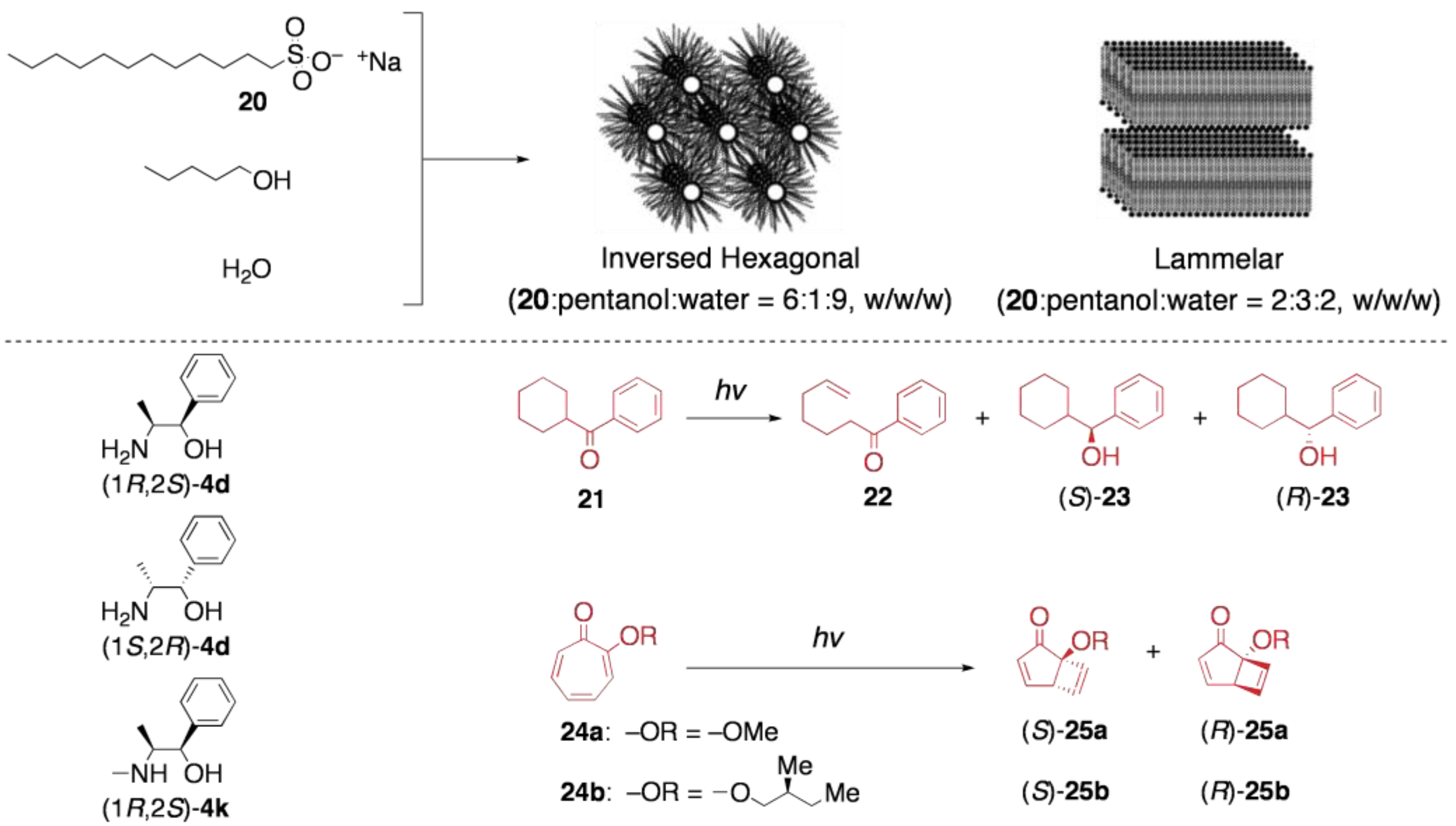 Contrary to thermotropic LC systems, lyotropic ones have rarely been explored as media for asymmetric reactions. Recently, Wu and Tung, et al. have reported on the asymmetric photoreactions in lyotropic LC reaction media. They employed lyotropic LCs based on the mixture of sodium dodecyl sulfonate (20), 1-pentanol, and water, which were doped with substrates and chiral inducers [56,57]. As a general feature of lyotropic LCs, two types of LC structures could form from the same constituents by changing the composition; with the ratio of 20/pentanol/water being 2:3:2 (w/w/w), a lamellar LC was yielded, while the weight ratio of 6:1:9 gave a hexagonal columnar LC (Figure 10).