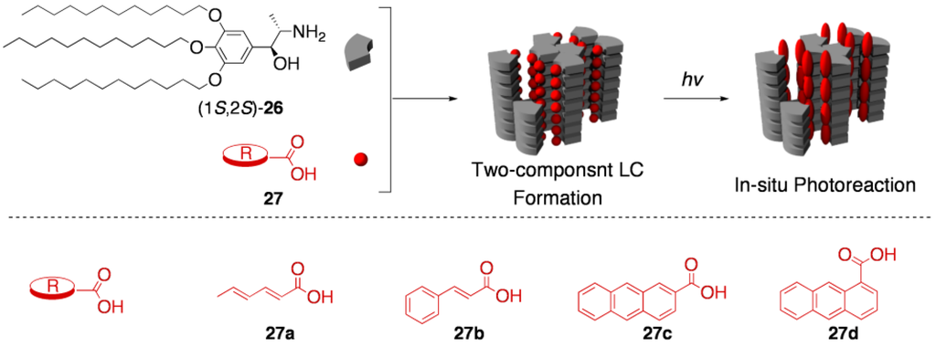 The amphiphilic 2-amino alcohol to construct the two-component LC, (1S,2S)-26, was synthesized from an (S)-alanine derivative in a stereopure form. The salts of (1S,2S)-26 with various carboxylic acids were prepared by mixing equimolar amounts of the units, and the mesomorphic behavior of the resultant salts was studied. As we had expected, (1S,2S)-26 was capable of forming liquid-crystalline salts with a variety of photoreactive carboxylic acids, including sorbic acid (27a), cinnamic acid (27b), 2-anthracenecarboxylic acid (27c), and 1-anthracenecarboxylic acid (27d). Although all of the LC salts are principally applicable to the in situ photoreactions, the photoinduced [4+4] cycloaddition of 2-anthracenecarboxylic acids (27c) was chosen as our initial target because of its simple reaction course, high quantum yield, and ease for product analysis. It still remains a challenge to control the regio- and stereochemistries of the photodimerization of 27c; the photodimerization in principle gives rise to no less than four configurational isomers (head-to-head/head-to-tail isomers with syn/anti isomerism, denoted as synHH, antiHH, synHT, and antiHT), two isomers of which consist of a pair of C2-enantiomers, respectively ((R)/(S)-antiHH and (R)/(S)-synHT) [58].