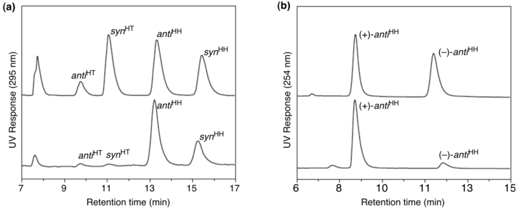 HPLC estimation of the isomer distribution of the photodimer esters 28. (a) An authentic mixture of the four isomers of 28 (top) and a mixture obtained from photo-irradiated 27c·(1S,2S)-26 (bottom). (b) An authentic racemate of antiHH-28 (top) and antiHH-28 obtained from photo-irradiated 27c·(1S,2S)-26 (bottom).