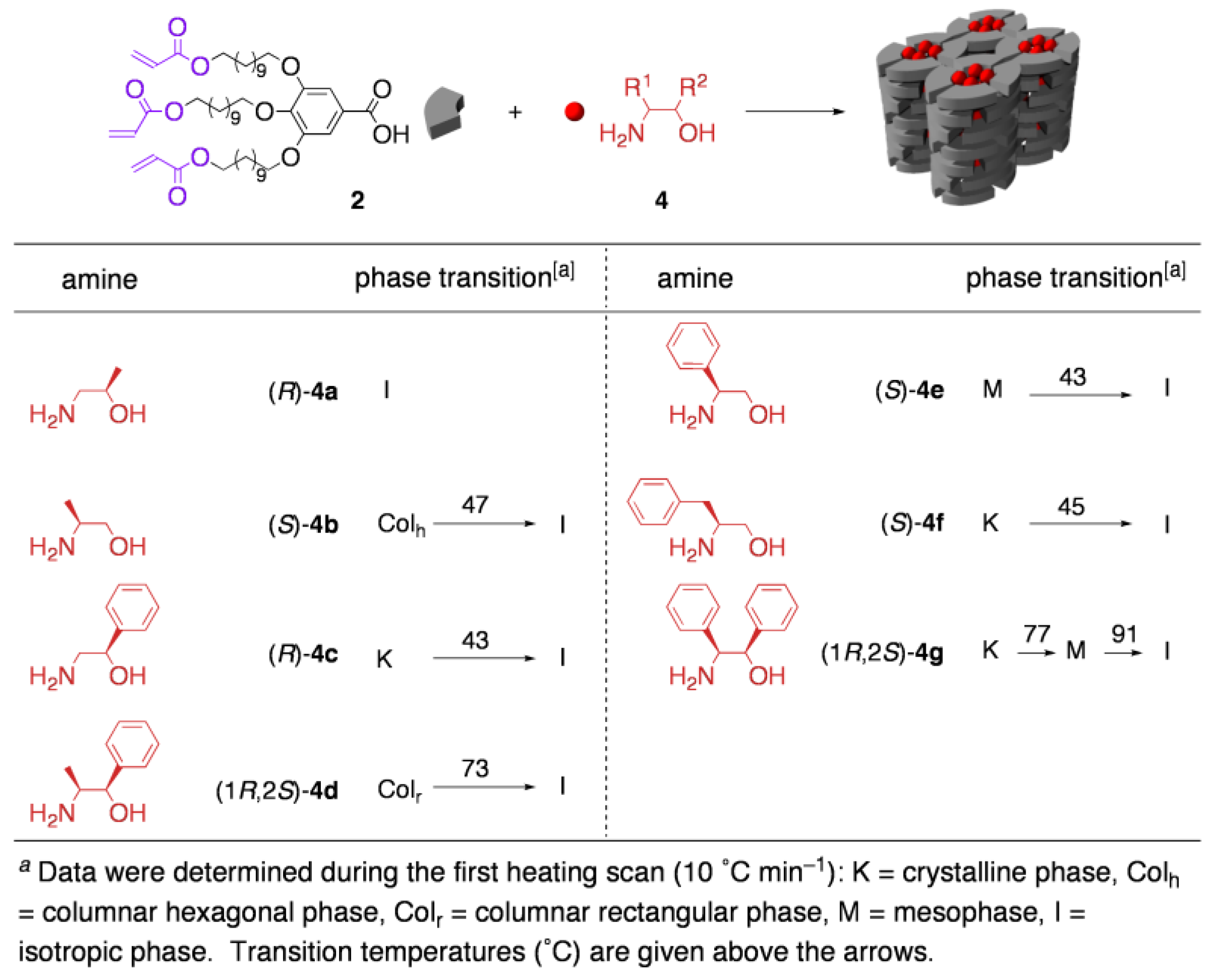 As suitable platforms to create cross-linked LCs with chirality recognition ability, we have recently developed a new class of ionic LCs; the salts of amphiphilic carboxylic acids with 2-amino alcohols have a strong tendency to exhibit thermotropic LC phases [16,18]. Considering the characteristic properties of the core unit (= 2-amino alcohol), our system would have special meaning from the following viewpoints: (i) 2-amino alcohols are one of the most easily available classes of enantiopure materials, which allow us to prepare various chiral architectures just by changing the core unit. (ii) The separation of the regio-/stereo-isomers of amino alcohols is of significant importance, because they are indispensable materials in most of the scenes of chiral technology.