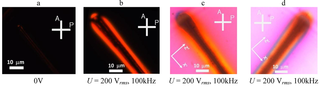 Under the microscope with crossed polarizers, in absence of , the dispersion of NRs appears dark because it is structurally and optically isotropic. When the field is applied, the clouds of NRs assembled by the field gradients near the central electrode (2), show strong birefringence, which implies an orientational order of NRs, Figure 6, Figure 7. The sign of birefringence can be determined with the help of an optical compensator []. A waveplate ( 530 nm) inserted into the optical pathway of microscope, induces yellow (total retardation less than 530 nm) interference color in the regions where the long axes of NRs are parallel to the slow axis Z’ of the waveplate, Figure 6(c,d) and Figure 7(c,d). A blue interference color (retardation higher than 530 nm) is observed in the regions where the NRs are aligned perpendicularly to the slow axis. We conclude that the birefringence of Au NR clouds is negative, i.e., the index of refraction for light polarized parallel to the long axes of Au NRs in dispersion is smaller than for the polarization perpendicular to them.