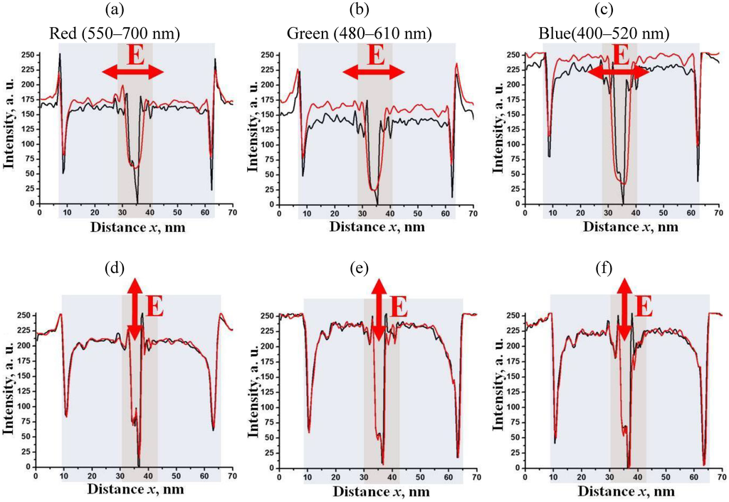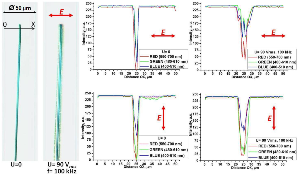 The most striking optical feature of cylindrical cells is that the applied field weakens the shadow of the central electrode, Figure 12, when the latter is observed in the orthoscopic mode under the microscope. The effect is wavelength and polarization dependent, being pronounced for light polarized perpendicularly to the capillary (and thus parallel to the Au NRs), Figure 12(a,b,c). We explored the wavelength dependence for “long/thin” NRs as for these the longitudinal peak of absorption is shifted towards the near infrared region []. The transmittance profiles measured for three spectral regions, “red”, “green” and “blue” (decoded from the RGB signal of CCD camera) show that the field-induced reduction of shadow is most pronounced in the “red” region with , i.e., where the field-induced birefringence is the highest, Figure 12(a). Propagation of light with parallel polarization is hardly affected by the electric field, Figure 12(d,e,f).