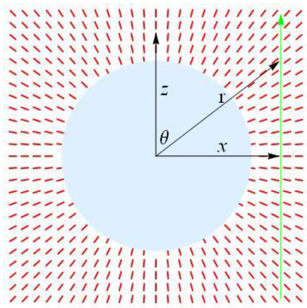 The fact that light rays follow curved trajectories in a medium with a varying refractive index has been known for a very long time in the physics of liquid crystals. In the simplest liquid crystal, the so-called uniaxial nematic, rod-like molecules align parallel to each other, along the common “director” . The director is a unit vector with a property (the medium is non-polar); it is also a local optic axis. The associated birefringence of a typical nematic formed by low-molecular-weight organic molecules is significant: the ordinary refractive index is often about 1.5, while the extraordinary index is about 1.7. In liquid crystals, the local orientation of molecules and thus the local optic axis can be made varying in space and time, for example, by setting proper surface alignment at the boundaries and applying an electric field to realign (a phenomenon at the heart of modern liquid crystal displays). The early liquid crystalline example for transformation optics has been presented by Grandjean in 1919 []. Grandjean considered a cylindrical nematic sample in which the director was arranged radially. When such a structure is illuminated with light polarized normally to the axis of cylinder, the rays are bent away from the central axis and leave a segment of an opening angle un-illuminated []. This particular example represents, loosely speaking, half a cloak, as the trajectories are diverging. The limitation of a regular liquid crystal is that although the ellipsoid of refractive indices is changing its orientation in space, it cannot be shrunk or expanded at will [,].
