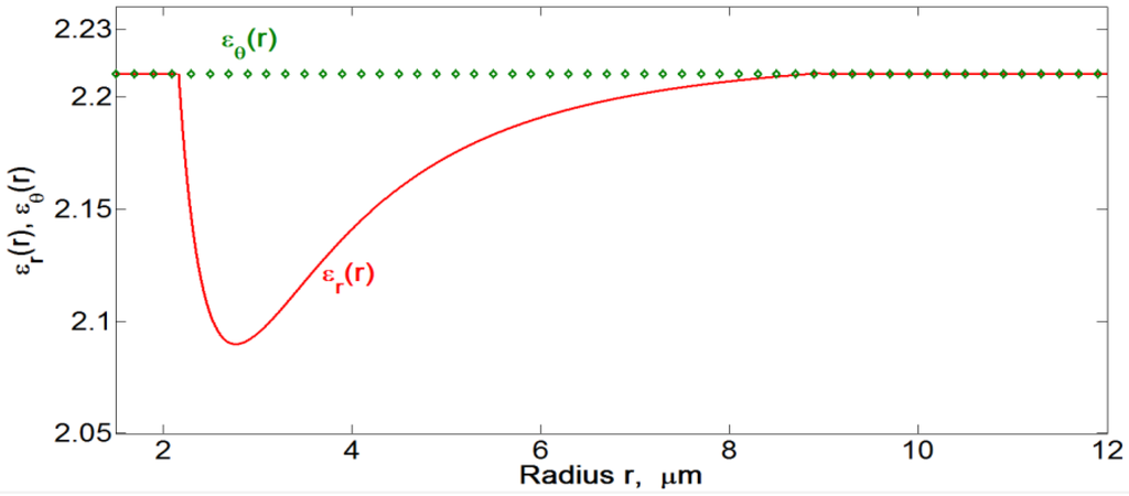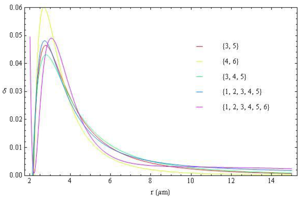 With Figure 19, we produce the fitting of the birefringence parameter , Equation (18), using different sets of m, Figure 20. The fitting curves for different approaches are very close to each other, signaling that the data on are robust. Apparently, the set m = {3,5} provides the most reliable fitting because further expansion of the basis of fitting functions does not improve the result substantially. Thus for this set we calculate the radial dependence of permittivity , Figure 21, assuming that the ordinary refractive index is constant across the capillary and equal to the refractive index of toluene , so that . The spatial distribution of the radial and azimuthal components of dielectric permittivity (refractive indices) induced by the gradient electric field (U = 200 Vrms, f = 100 kHz) in a flat cell shown in Figure 21 is one of the major results of this work. These dependences will be used in the numerical simulations of light propagation through the Au NRs dispersion in cylindrical cells, Section 4.3.
