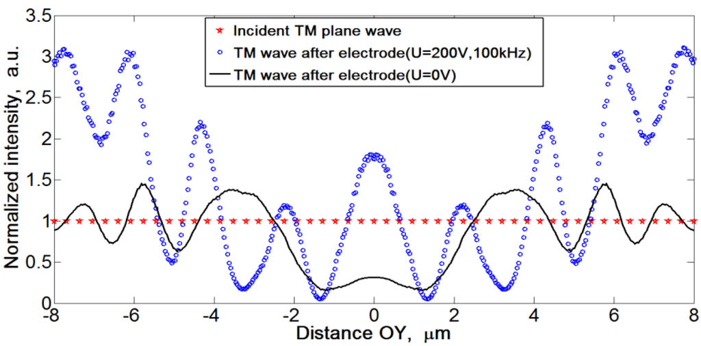 Normalized intensities of incident TM plane wave before the central electrode (red stars), TM wave behind the central electrode with the electric field-induced variation of the extraordinary refractive index (empty blue dots), and TM wave behind the central electrode when the electric field is switched off (solid black line). In the center of shadow, near OY = 0, the light intensity in the “field on” case is higher than in the “field off” case.