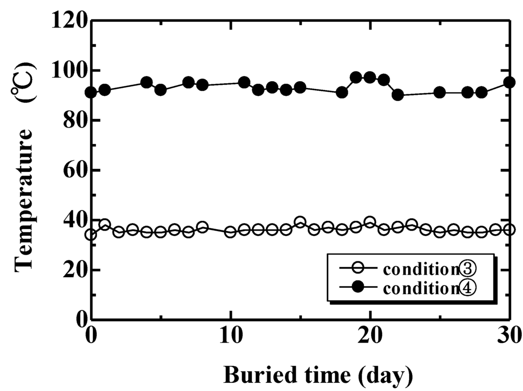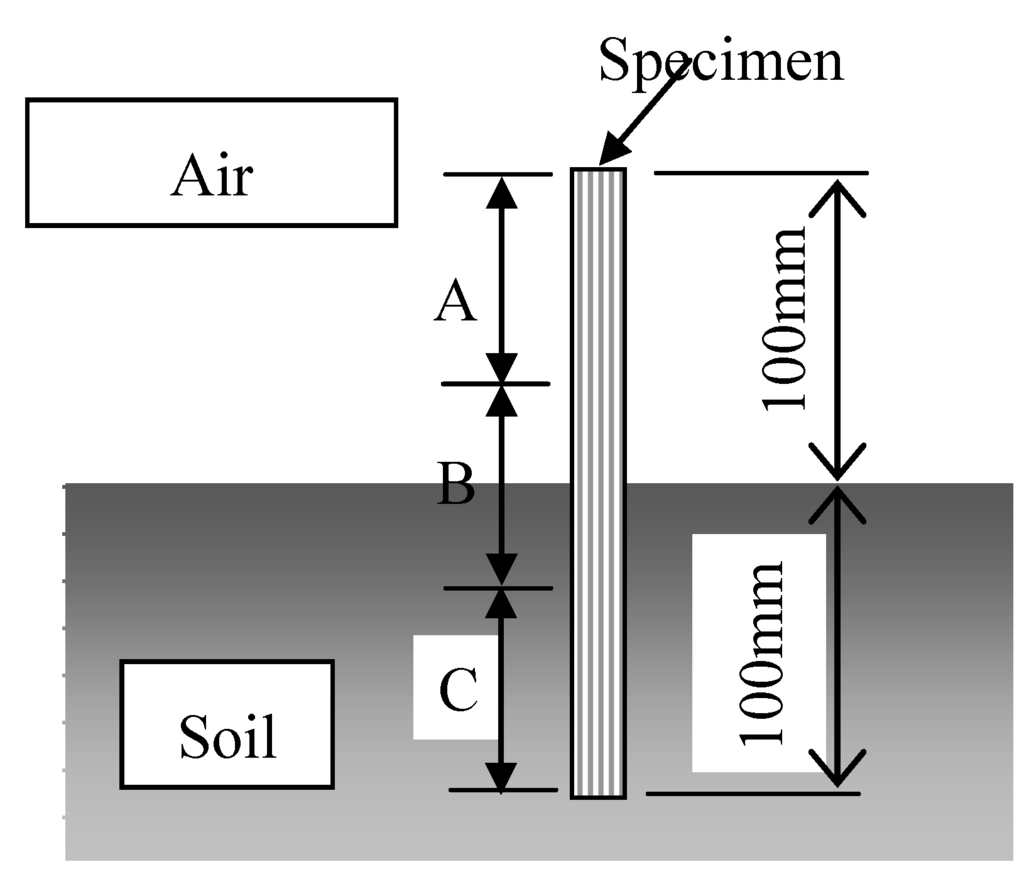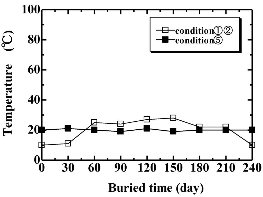 Biodegradability tests were carried out under five conditions. In Condition 1, specimens were completely buried in a natural soil at a depth of 100 mm, as shown in Figure 2. In Condition 2, a 100 mm section of the specimens were buried in natural soil as shown in Figure 3. This examination under Condition 2 was to observe the biodegradability from three factors: air (Figure 3 A), air and soil (Figure 3 B) and natural soil (Figure 3 C). Conditions 3 and 4 examined specimens in compost soils generated using two types of garbage-processing machines (BDG-150 and BG-CX20; Hitachi Ltd.). The BDG-150 operated at around 36 °C (Condition 3), and the BG-CX20 operated at around 90 °C (Condition 4). After a trial operation for several days in order to activate microorganisms in the compost media (wood chips), MHFRP samples were placed within the processing media, and the biodegradation behavior of the composites was investigated. Specifically, samples were placed inside a nylon netting to aid in recovering the degraded samples from the media, and then the netting and sample were buried in the compost media according to the experimental conditions. In Condition 5, specimens were kept indoors, in desiccators, at 20 °C and 50% relative humidity. The duration of the biodegradability tests was 240 days for Conditions 1, 2 and 5, and 30 days for Conditions 3 and 4. The temperatures of the examining environments of Conditions 1, 2 and 5 (20 °C) as well as Conditions 3 (36 °C) and 4 (90 °C) are shown in Figure 4 and Figure 5, respectively.