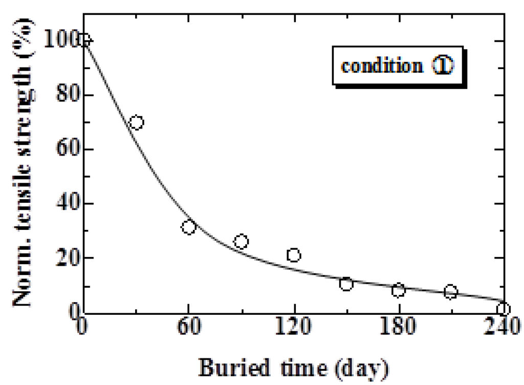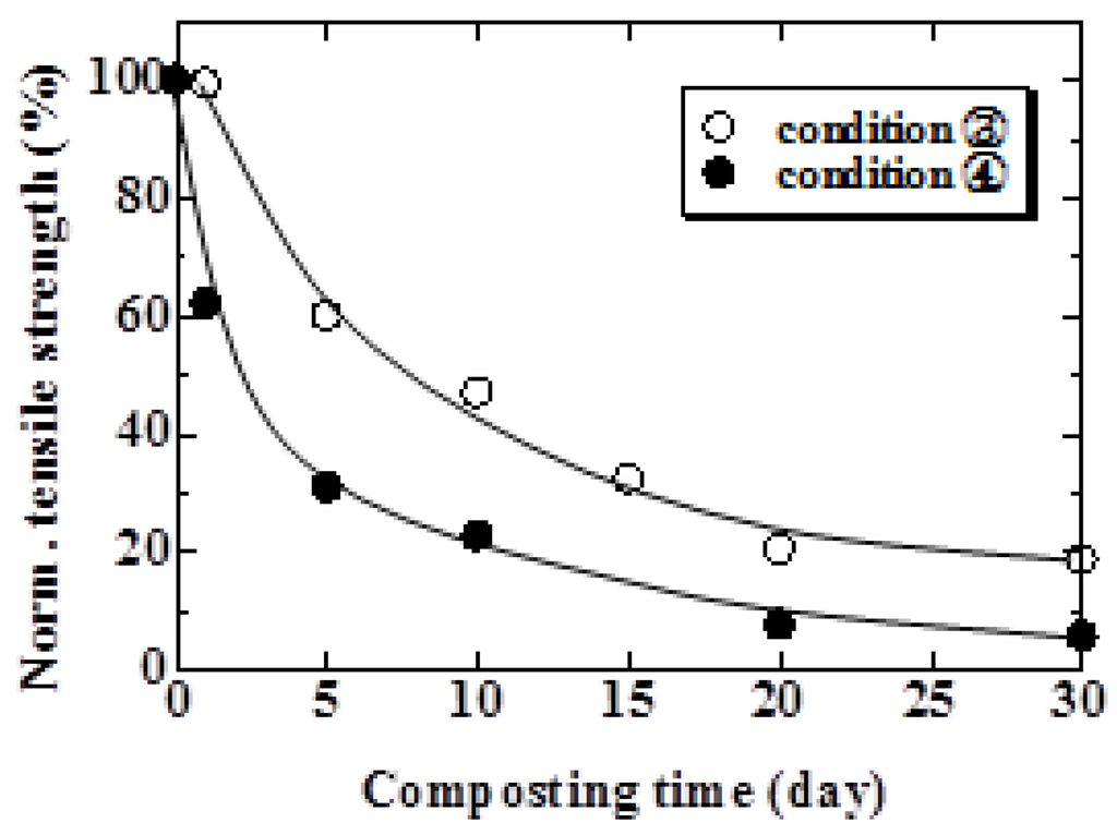 The relationship between normalized tensile strength and composting time for the conditions using the compost soil is shown in Figure 8. As seen in this figure, the tensile strength of the specimen under Conditions 3 and 4 decreases after a composting test of 5 days and 1 day, respectively. The period of decreasing tensile strength compared to that with natural soil (Figure 6 and Figure 7) is remarkably short. Moreover, the tensile strength of the composted specimen at high temperature showed the largest decrease; the strength gradually decreased to the 0 MPa level at 30 days.