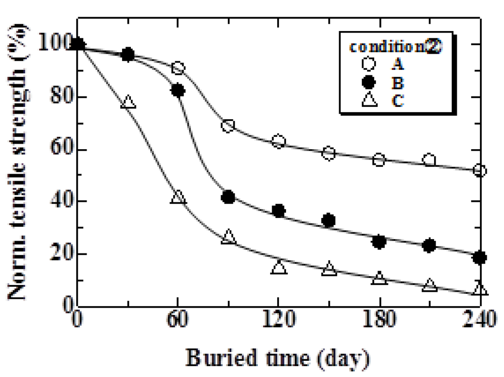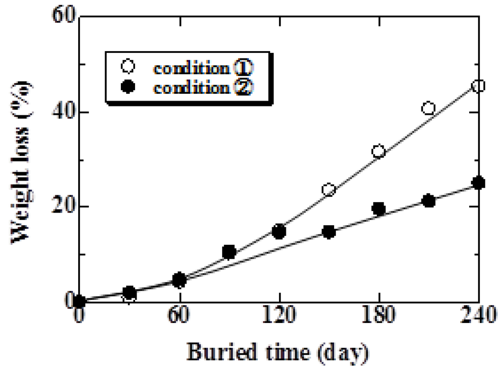 - Weight loss of the specimen completely buried under the soil showed a value of approximately 1.8 times that of the specimen of which only half was buried under the soil at 240 days (45% vs. 25%, respectively). A weight loss of 30% was observed with the specimen in compost at 90 °C for 30 days and a similar level of weight loss was seen in natural environments at 180 days.