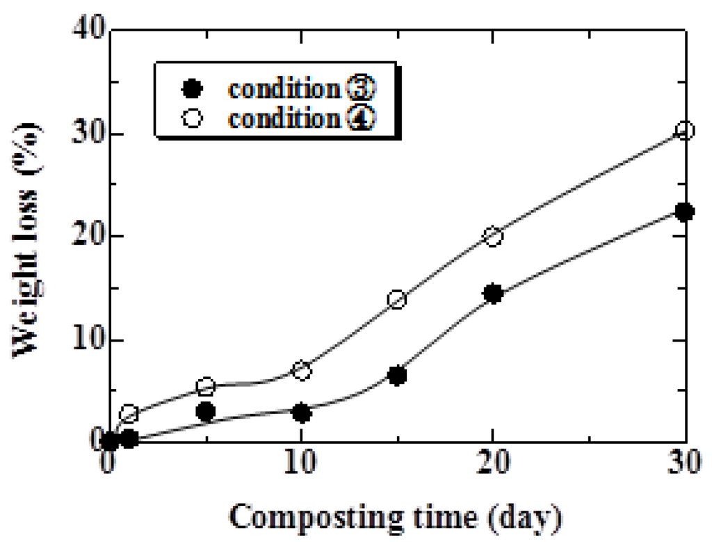 The relationship between weight loss and burial time for Conditions 1 and 2 are shown in Figure 9. As shown in this figure, weight loss increased with increasing burial time. Comparing Condition 1 with Condition 2, the weight loss of the specimen examined under Condition 1 was approximately 1.8 times of that under Condition 2 at 240 days. These results suggest that the specimen with many parts contacting microbes in the soil biodegrade early. The relationship between weight loss and composting time is shown in Figure 10. The weight loss under Conditions 3 and 4 was 23 and 30% at 30 days, respectively. As shown in this figure, in both conditions, weight loss increased gradually for 10 days and then suddenly increased thereafter. From the data in Figure 8, tensile strength decreased rapidly until 10 days and then gradually decreased thereafter. The strength of hemp fiber is influenced by the degree of polymerization of the cellulose [18]. This behavior suggests that the degree of polymerization of the cellulose decreased, and fiber itself biodegraded thereafter.