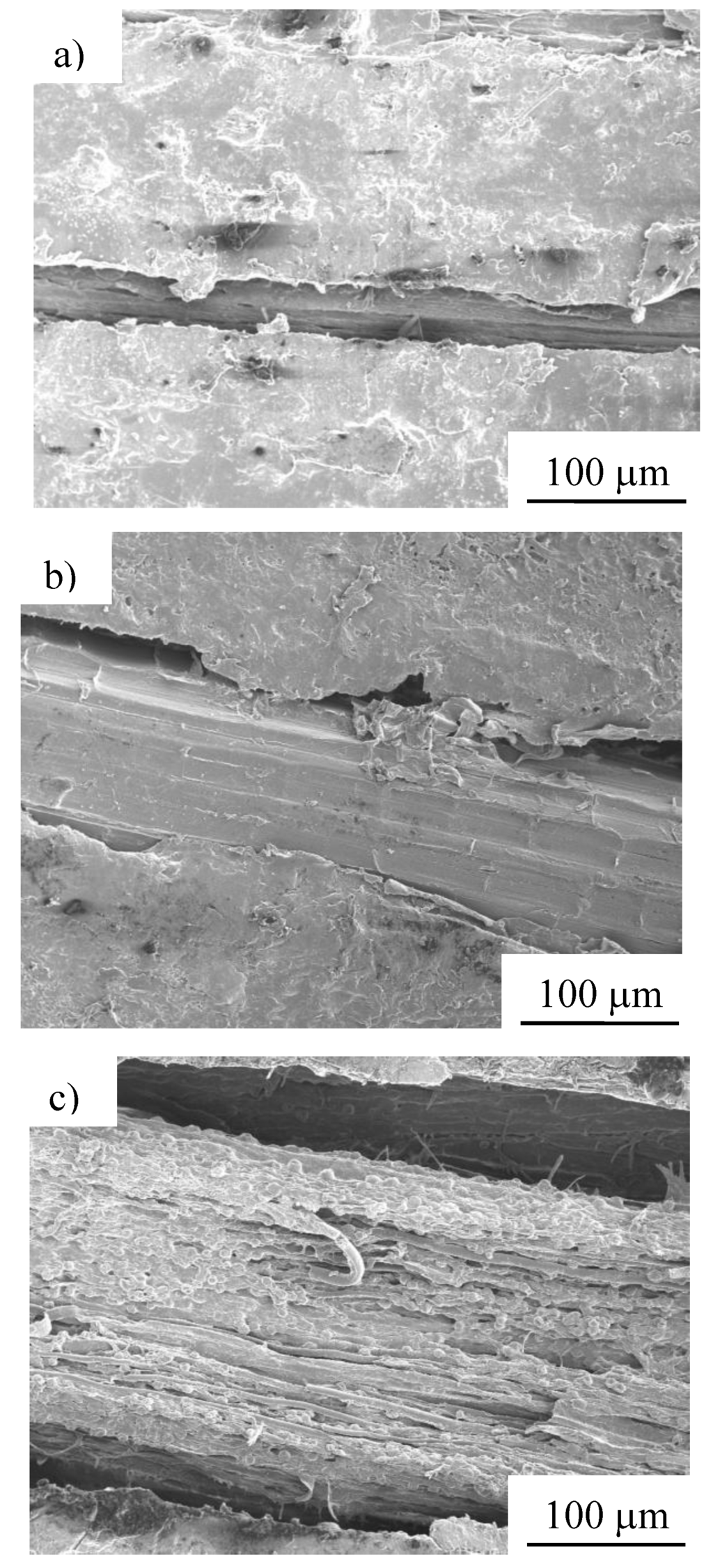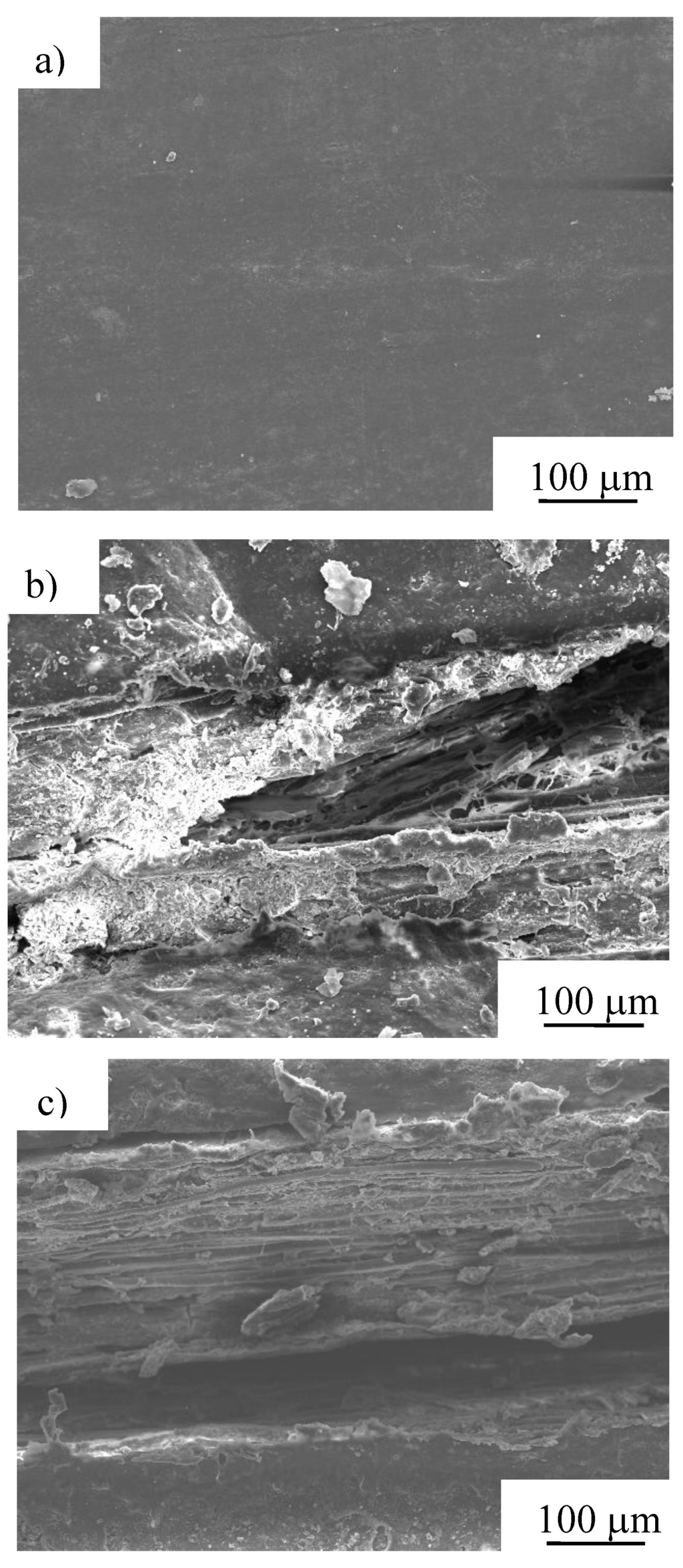 Scanning electron microscopy (SEM) photomicrographs of the specimen tested under Condition 1 are shown in Figure 11. The specimens depicted in Figure 11 a, b and c were tested after burial times of 30, 180 and 240 days, respectively. As shown in these figures, the change in condition of the specimen is remarkable with increasing burial time. Only the surface resin can be seen on the specimen at 30 days. At 180 days, the surface resin of the specimen has degraded, exposing the internal fibers. At 240 days, delamination is seen between the fibers and the resin, and single fibers assembling fiber bundle were observed.