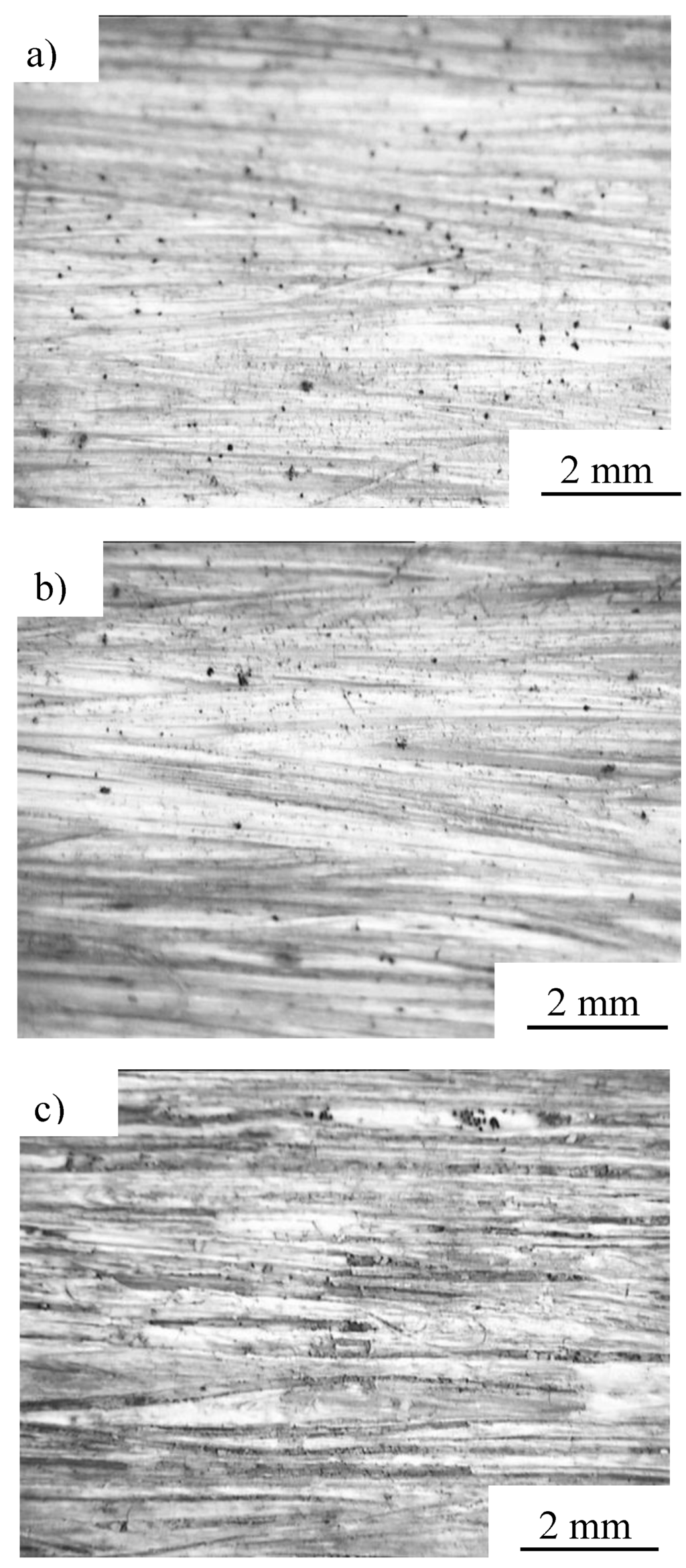 Survey photomicrographs of the specimen biodegraded for 240 days in the case of Condition 2 are shown in Figure 12. The upper, middle and lower parts of the specimen (air; air and natural soil; natural soil, respectively) are depicted in Figure 12 a, b and c, respectively. From these figures, changes in the condition of the upper part of the specimen are not observed, however, at the lower part, whitening of the resin and exposure of the fiber bundle was seen. The change in state of the specimen seen here influences the tensile strength (see Figure 7). MHFRP show remarkable biodegradation when in contact with microbes in the soil.