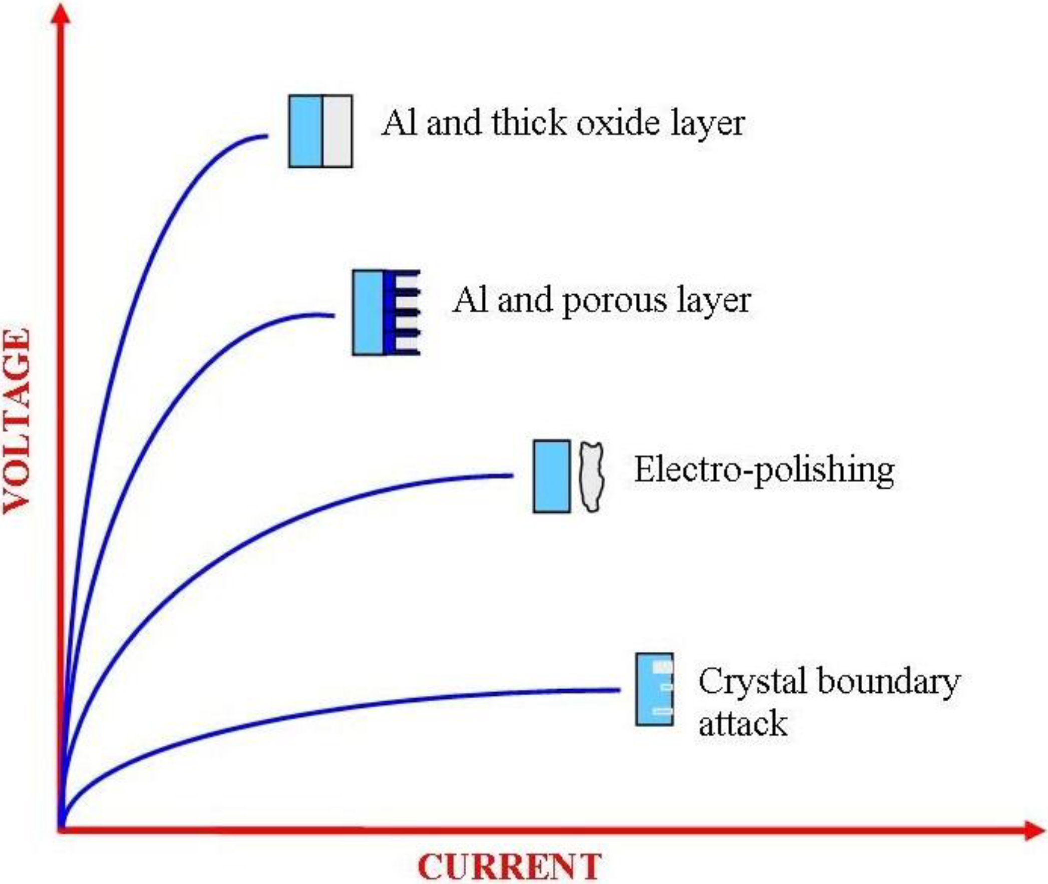To use Al effectively for a wide variety of applications means that the metal needs to be protected. Anodization of Al was first used on an industrial scale in the mid 1920s, since then the range of applications has steadily increased and accordingly the anodization process has been actively investigated and refined [17]. It is known that during the anodization process, Al produces a highly impervious protective layer on its surface. The anodic layer parameters such as barrier layer thickness, pore diameter and pore height are directly dependent upon the steady-state voltage used in the creation of the layer [18,19,20,21]. This is graphically presented in Figure 1, which also shows the results of varying both the voltage and the current on the surface of an Al sample. It can be seen that at low voltages and high currents, pitting at the crystallographic boundaries begins, while at higher voltages and lower currents, electro-polishing effects take place. As the voltage is further increased, the current decreases and a porous layer will form. And finally, at extremely low currents and high voltages, a thick layer of Al oxide is formed.