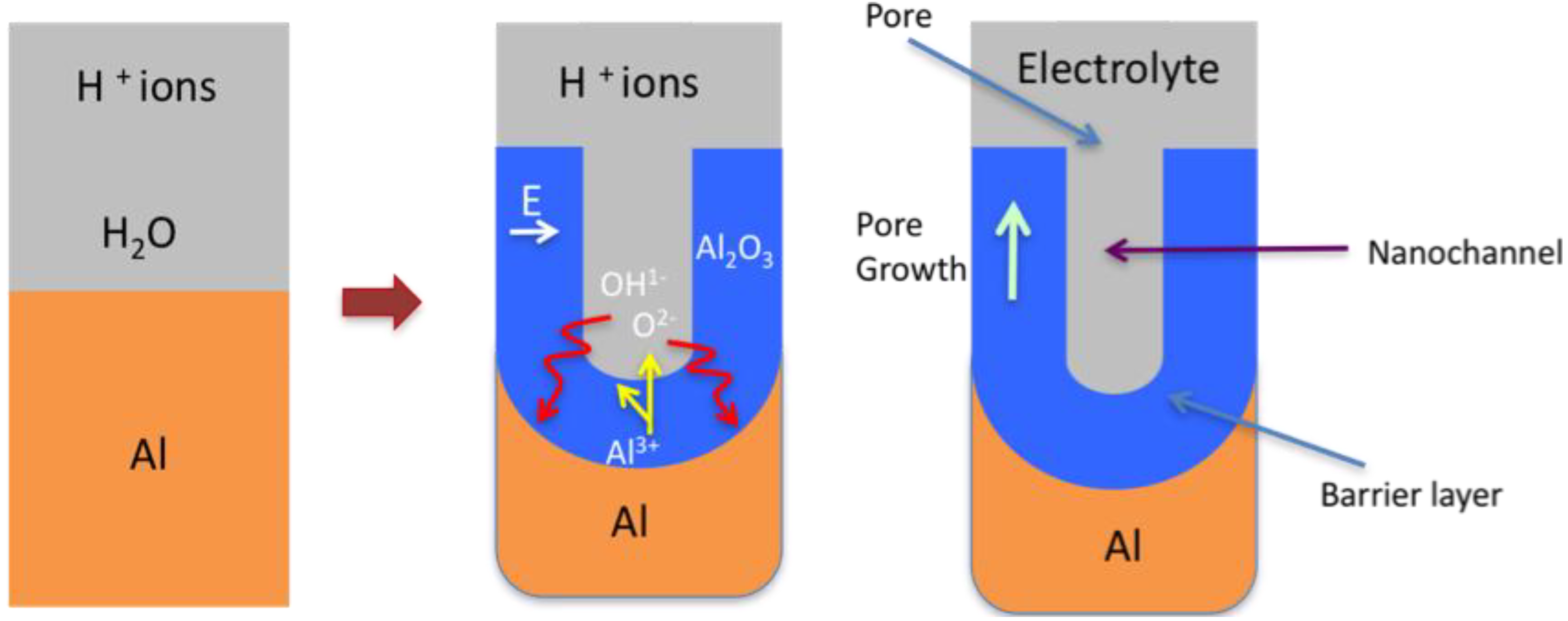 In the early stages of the anodization process Al3+ ions migrate from the metal across the metal/oxide interface into the forming oxide layer [71]. Meanwhile O2- ions formed from water at the oxide/electrolyte interface travel into the oxide layer. During this stage approximately 70% of the Al3+ ions and the O2- ions contribute to the formation of the barrier oxide layer [72], the remaining Al3+ ions are dissolved into the electrolyte. This condition has been shown to be the prerequisite for porous oxide growth, in which the Al-O bonds in the oxide lattice break to release Al3+ ions [73]. During the oxide formation the barrier layer constantly regenerates with further oxide growth and transforms into a semi-spherical oxide layer of constant thickness that forms the pore bottom, as shown in Figure 5.