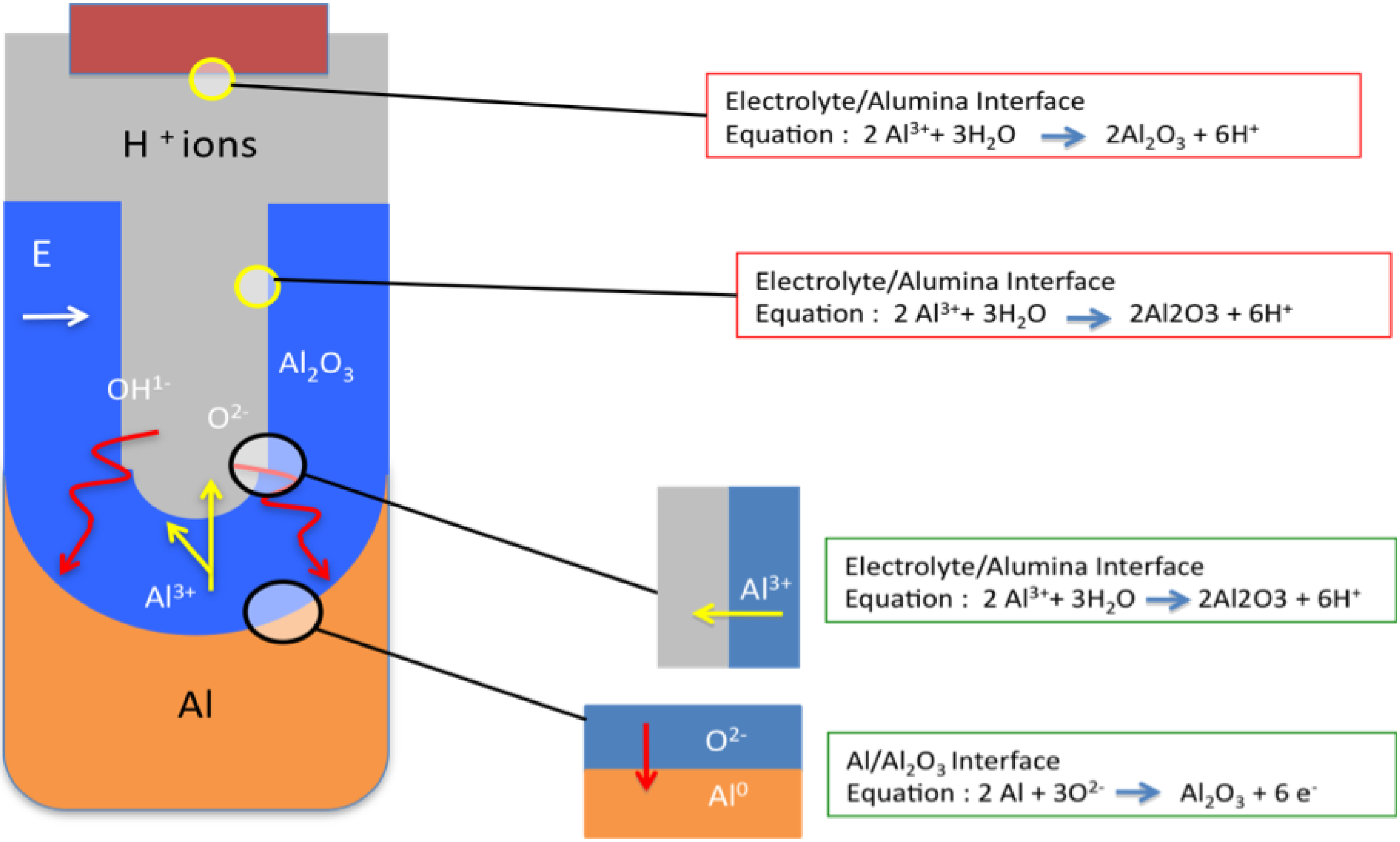 The formation mechanism is straightforward and consists of two stages. In the first stage a constant current density is maintained, while the voltage increases linearly with time. To maintain the constant current density, the electric field strength must also be constant across the barrier layer, thus as the barrier layer grows the voltage increases until the formation voltage is reached. In the second stage the formation voltage is maintained while the barrier layer continues to grow by the migration of Al3+ ions outwards into the electrolyte and the inward motion of O2- and OH- ions [17], see Figure 4. The oxide formation occurs at both the metal/oxide and the oxide/electrolyte interfaces, with approximately 60% of the oxide growth occurring at the metal/oxide interface where the O2- and OH- ions combine with the Al metal. The balance of the porous growth occurs at the oxide/electrolyte interface where the Al3+ ions react with the water molecules in the electrolyte. As the thickness of the barrier layer increases, the electrical resistance also increases, the metal/oxide and oxide/electrolyte interfaces remain planar and the current flow decreases with time. Towards the end of this stage the barrier layer has fully formed and remains constant. Thus, the layer growth has decreased to a point where it is equal to the rate of dissolution. During this process the Faradaic current efficiency in building the oxide layer is high, close to 100% [54]. In addition, the resulting barrier layer thickness is directly proportional to the applied voltage and is approximately 1.0 to 1.4 nm per volt. The formation of the oxide tends to produce a level surface, with any initial minor surface imperfections such as roughness being filled-in by the forming oxide. The resulting oxide thickness is generally uniform and any surface flaws in the metal surface tend to produce localized current concentrations that result in some increased thickening of the oxide. At the end of this anodization process the surface chemistry is stabilized and resists any further reactions with its environment. In addition, the resultant barrier layer is hard, wear resistant and behaves as an electrical insulator.