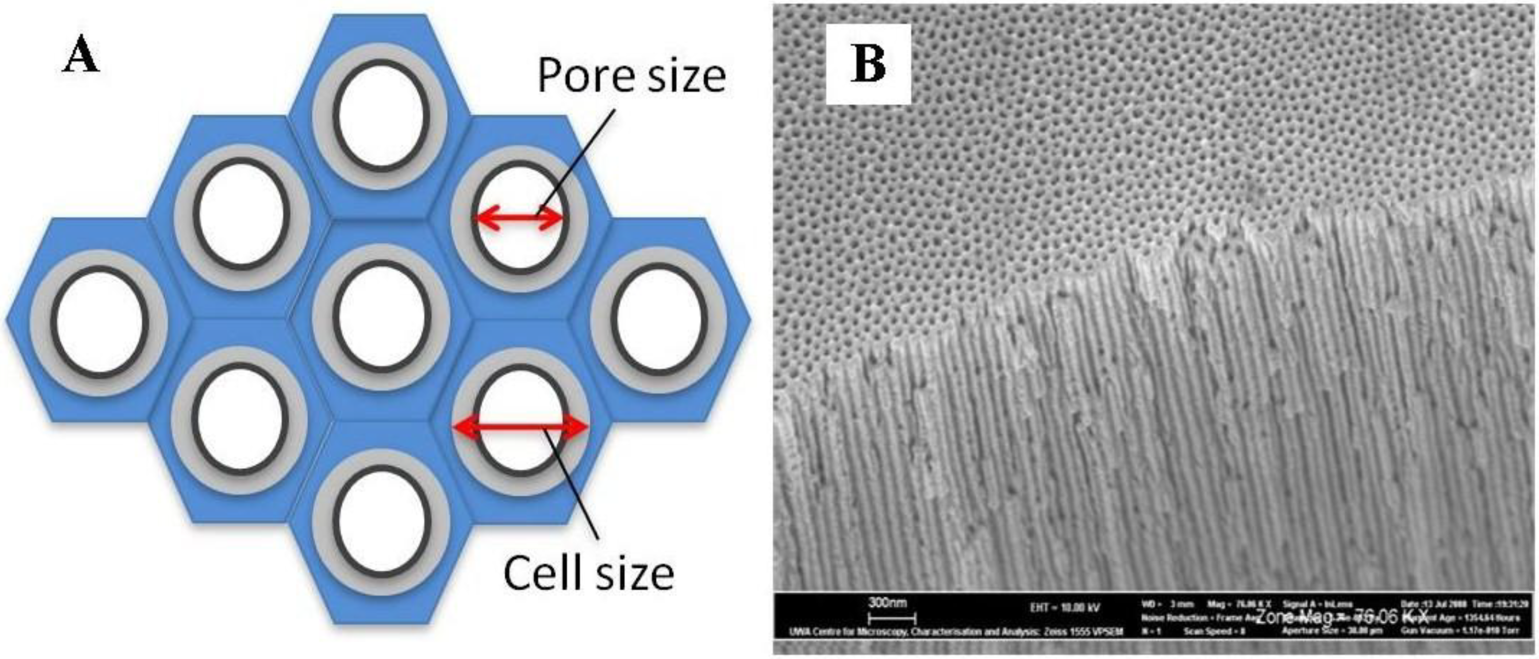 The advantage of using porous alumina as a template is that it enables selected nano-pore fabrication using general laboratory equipment, see Figure 2. The proportionality of the cell size with respect to the electrochemical conditions allows one to macroscopically dictate the growth and final size of the pores manufactured. The equation is a simple one where an Al substrate is used with a particular acid to achieve nano-pores with an empirical derived set of electrochemical conditions.
