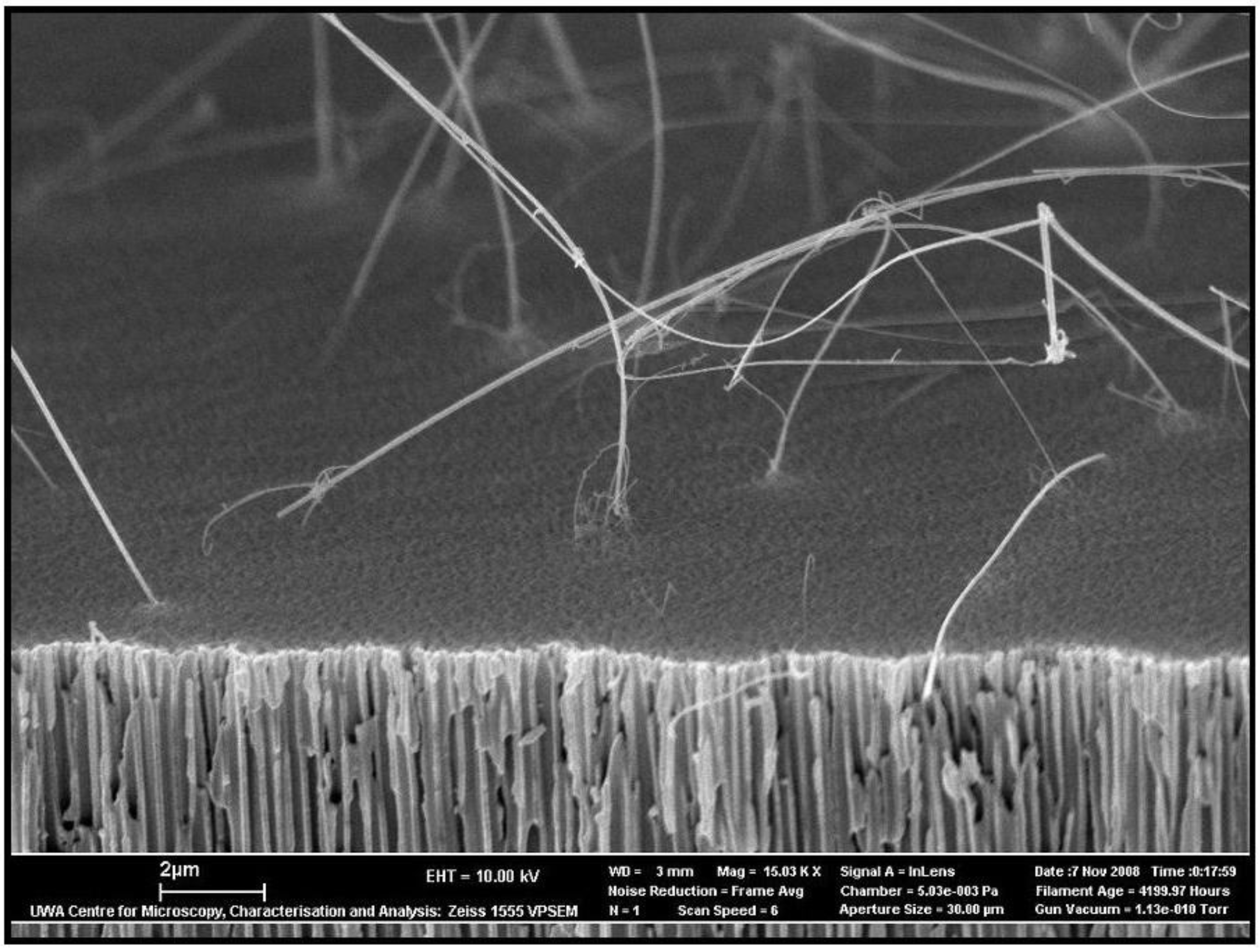 The anodization process of metals has been used by industry to protect metal components from corrosion for approximately 90 years. During this electro-chemical process the surface chemistry of the metal is changed, via oxidation, to produce an anodic oxide layer that is thick enough to stifle further oxidation. Aluminum metal (Al), because of its high strength to weight ratio, has found numerous engineering applications [1,2] and as early as the mid 1920s components on seaplanes used in aviation transportation were being anodized in chromic acid [3]. Two types of anodic Al oxide exist; the first is a non-porous barrier layer that is thin, hard, wear resistant and behaves as an electrical insulator. The second, a thicker porous oxide structure, is called the anodic aluminum oxide (AAO) layer. This layer structure has a high aspect ratio and consists of a porous structure. In engineering applications, this pore structure must be sealed to prevent corrosion. Oxide layers generated during anodization can also be produced on materials such as: magnesium (Mg), niobium (Nb), silicon (Si), tantalum (Ta), tin (Sn), titanium (Ti), tungsten (W), zinc (Zn) and zirconium (Zr).